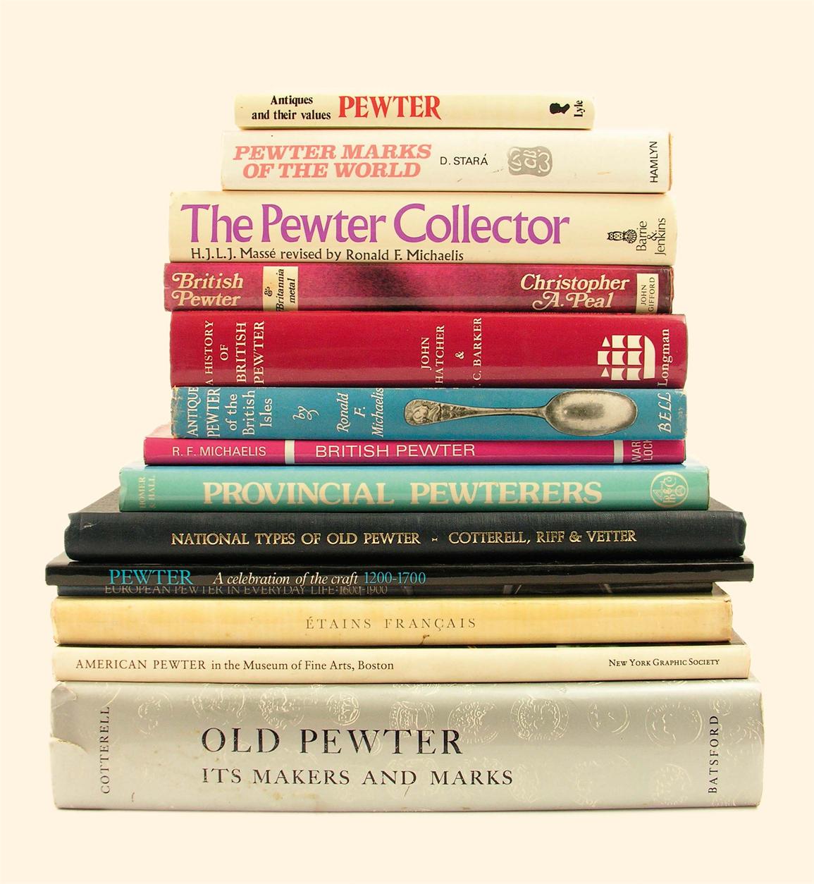 Howard Herschel Cotterell. Old Pewter, Its Makers and Marks, 1964; Christopher A Peal. British Pewter & Britannia metal, 1971; H.J.L.J.Masse. The Pewter Collector, 1971; Ronald F. Michaelis. Antique Pewter of the British Isles, 1955; Ronald F. Michaelis. British Pewter, 1969; R.F. Homer & D.W. Hall, Provincial Pewterers, 1985; Cotterell, Riff & Vetter. National Types of Old Pewter, 1935; John Hatcher & T C Barker. A History of British Pewter, 1974; D.Stara. Pewter Marks of the World, 1978; Tony Curtis. Antiques and their values, Pewter, 1978; American Pewter in the Museum of Fine Arts Boston, 1974; B A Douroff. Etains Francais; Pewter A celebration of the craft 1200-1700; European Pewter in Everyday Life (1600-1900). (14)