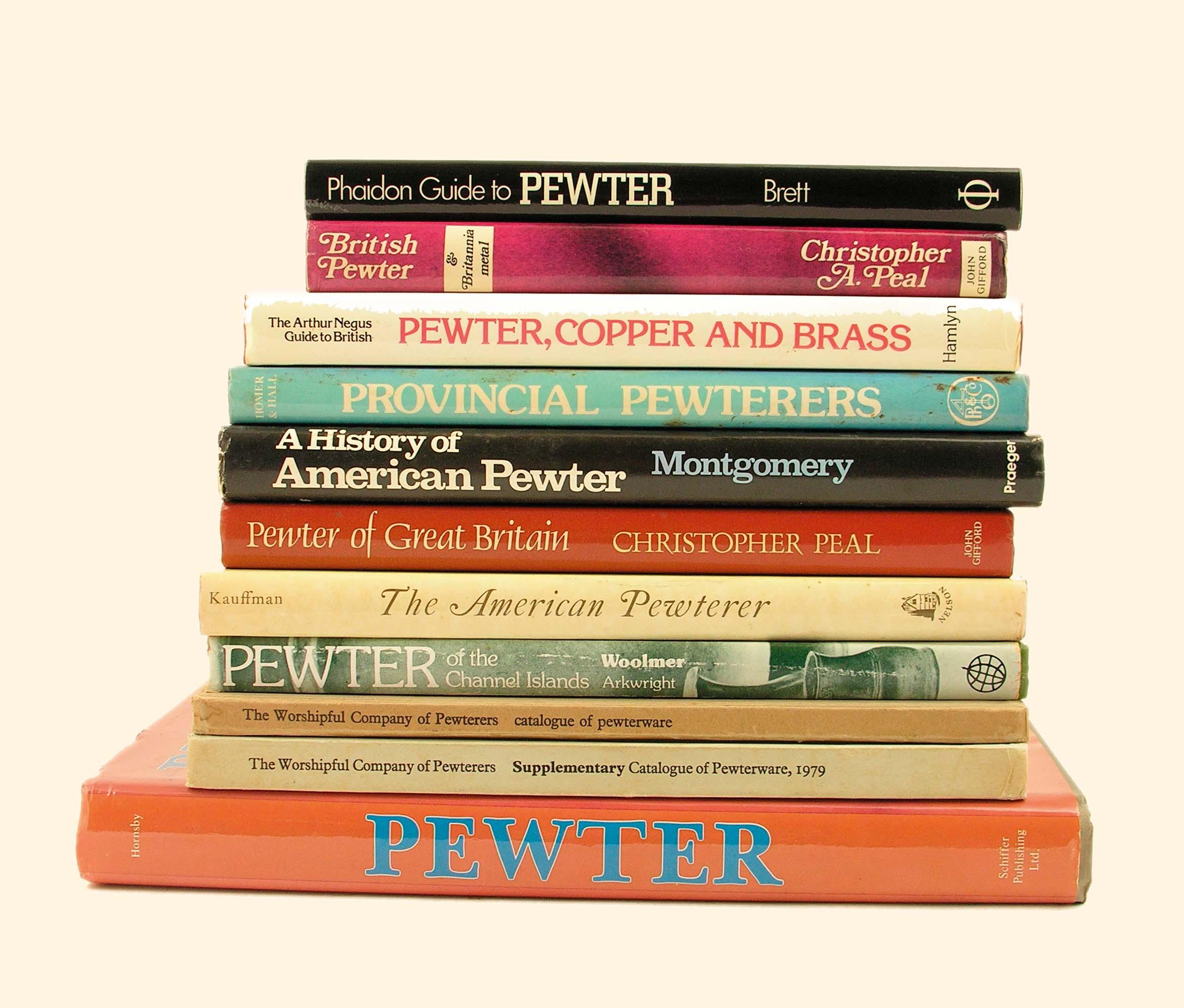 Henry J Kauffman. The American Pewterer, 1971; Charles F Montgomery. A History of American Pewter, 1973; Stanley C Woolmer. Pewter of the Channel Islands, 1973; Christopher Peal. Pewter of Great Britain, 1983; Peter Hornsby. The Arthur Negus Guide to British Pewter, Copper and Brass, 1981; R F Homer & D W Hall. Provincial Pewterers, 1985; Christopher A Peal. British Pewter & Britannia metal, 1971; Peter R G Hornsby. Pewter of the Western World, 1600 - 1850, 1983; Venessa Brett. Phaidon Guide to Pewter, 1981; A short history of The Worshipful Company of Pewterers of London and a catalogue of pewterware in its possession, 1968; Supplementary Catalogue of Pewterware, 1979. (11)