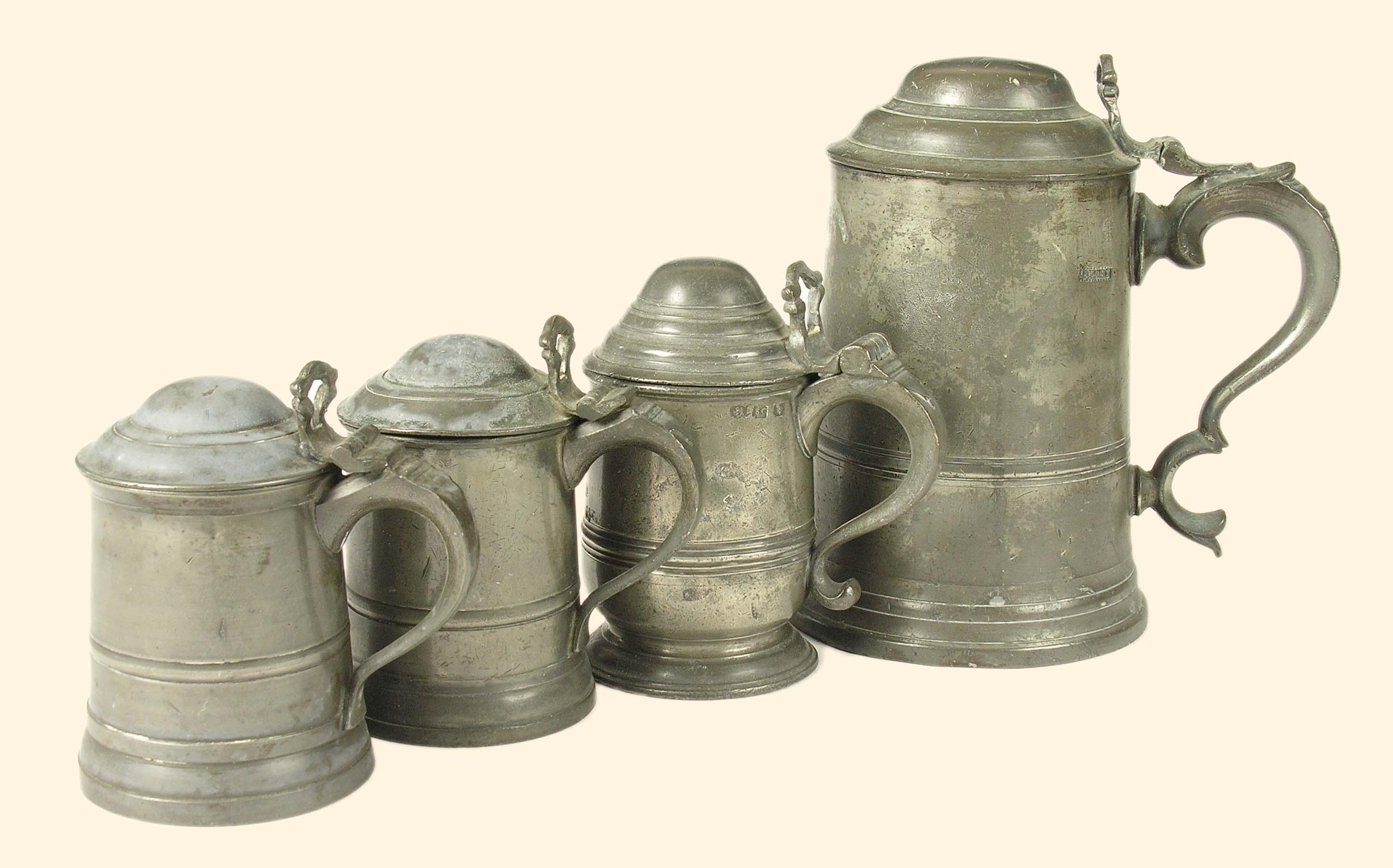 A 19th century pewter lidded quart tankard, with a tapering drum, double domed lid with open chair back thumbpiece, 7.5in (19cm) h., and three 1/2 pint lidded tankards, the pear shape example with 'hallmarks' for 'SC'. (4)