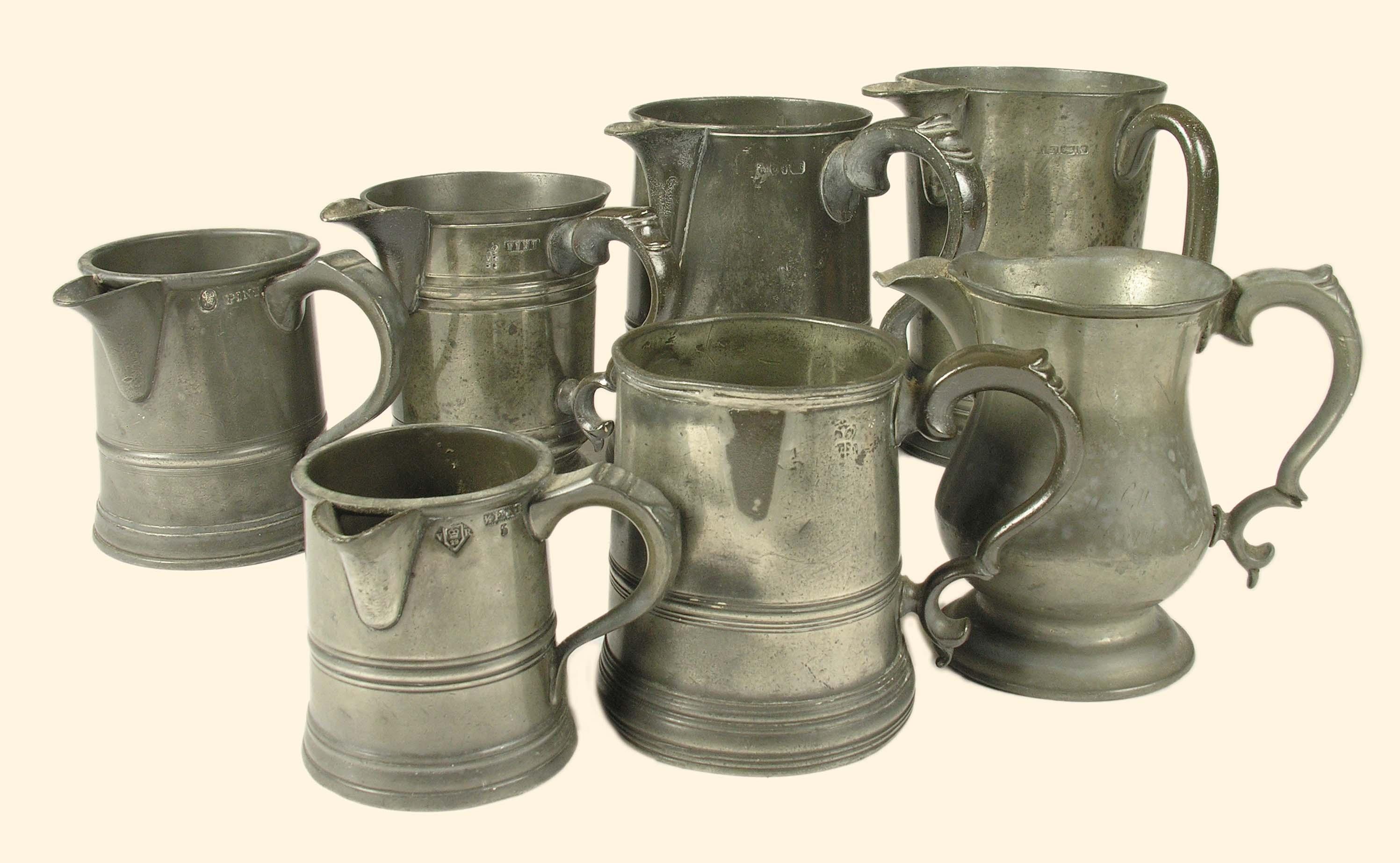 A Victorian pewter spouted pint mug, by G. Farmiloe & Sons, London, the tapering body inscribed 'M.A.Higgins, Good Intent, Borstat', 5in (12.6cm) h., four pewter spouted mugs, quart (2), pint, 1/2 pint, two with tavern names to the base, a pint mug, previously spouted, and a Scottish baluster jug, stamped 'Rt GALBRAITH, GLASGOW'. (7)