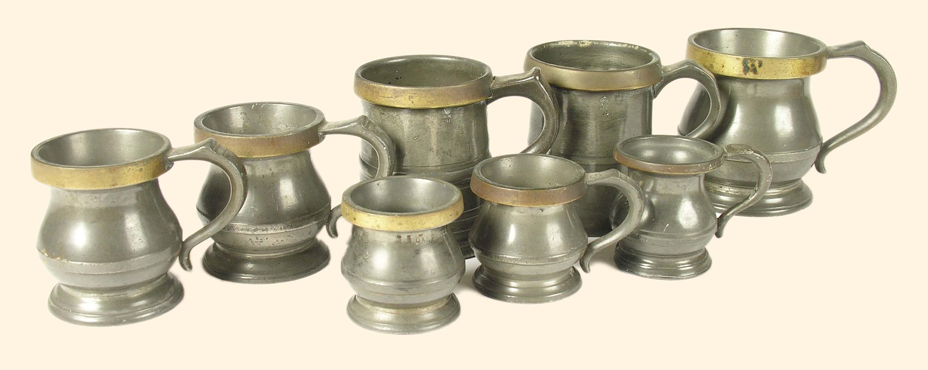 Eight pewter measures with brass rims; four by W.R Loftus, London, Half Pint, Gill (2), handleless Half Gill; two other half gill balusters and two half pint tapering types. (8)