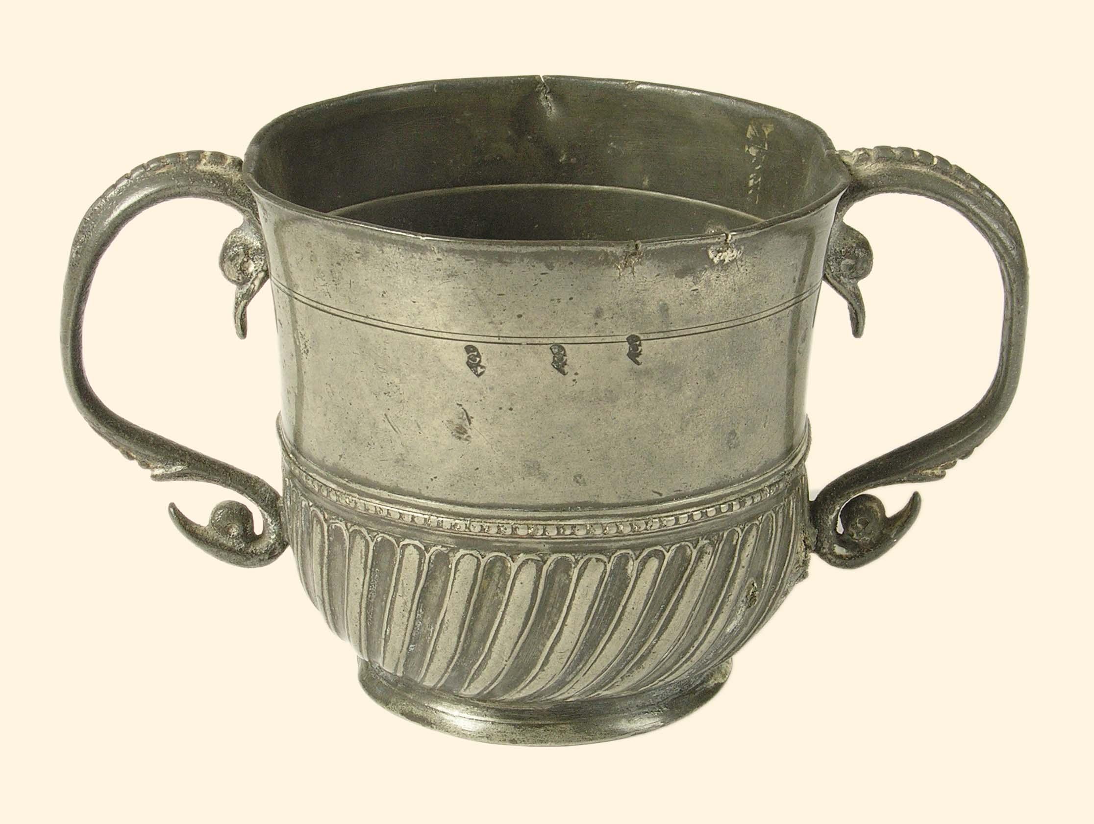 A pewter two handled cup, c.1700, with a part gadrooned body and a pair of part bead scroll handles with bird's head terminals, the body with 'hallmarks' of 'G above a fleur-de-lys', 3.75in (9.5cm) h.