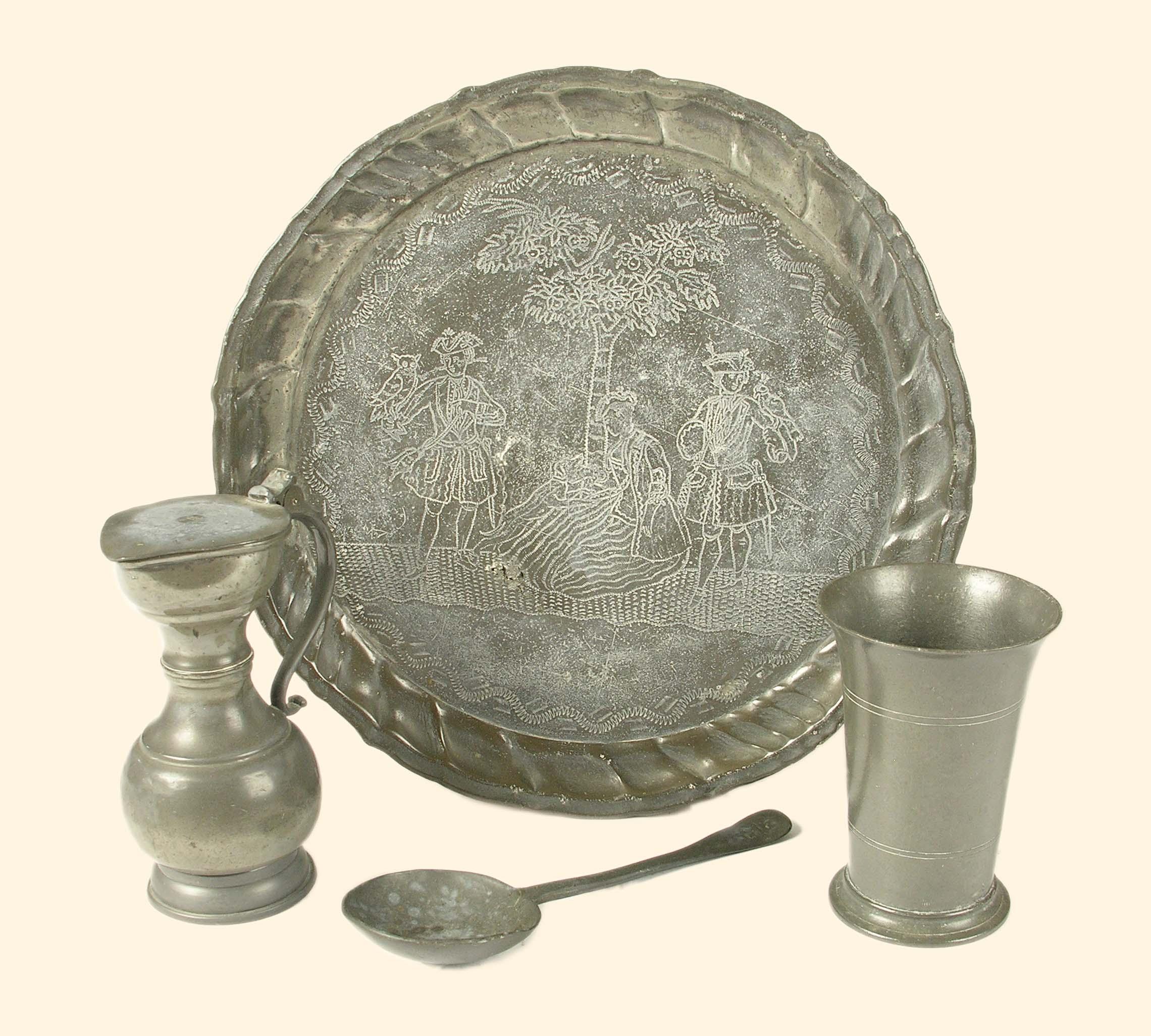 A continental pewter wriggle-work plate, decorated two falconers and a lady seated under a tree, with a moulded edge raised rim, by John Dieterich, with angel touches, 11in (28cm) dia., a lidded bulbous measure, a flared beaker and a spoon. (4)