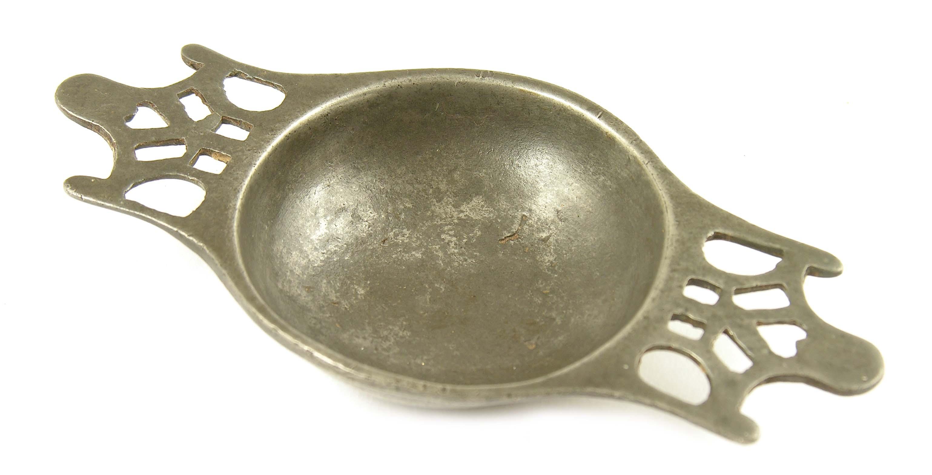 A continental pewter wine taster, with pierced handles, marks to the underside including TC, 19th century, 4.75in (12cm) across handles.