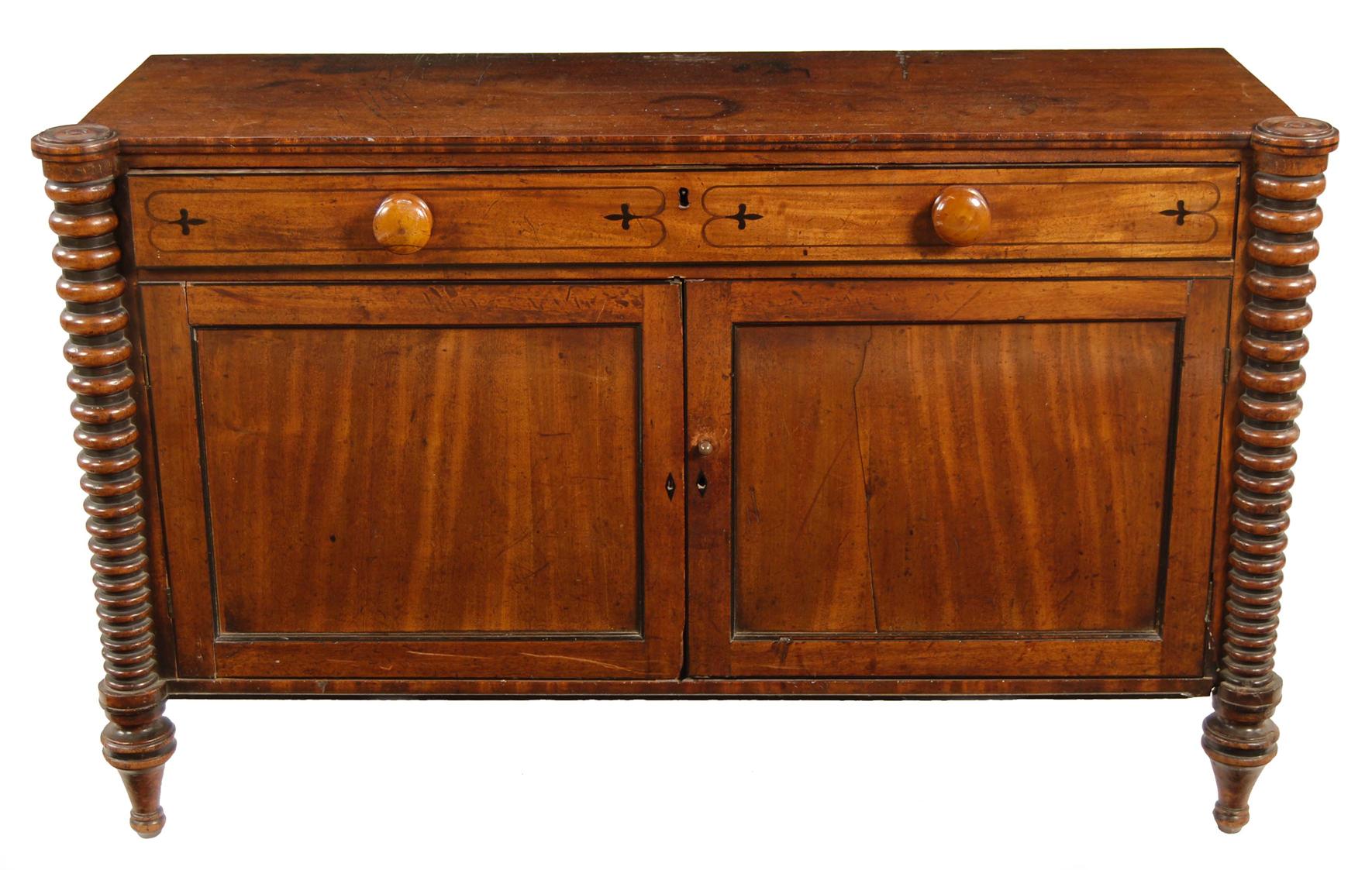 An early 19th century mahogany low side cabinet, inlaid ebonised stringing with a frieze drawer fitted later knob handles above a cupboard, flanked by ring turned columns, 30.5in (77.5cm) h, 50in (127cm) w, 16.25in (41.4cm) d.