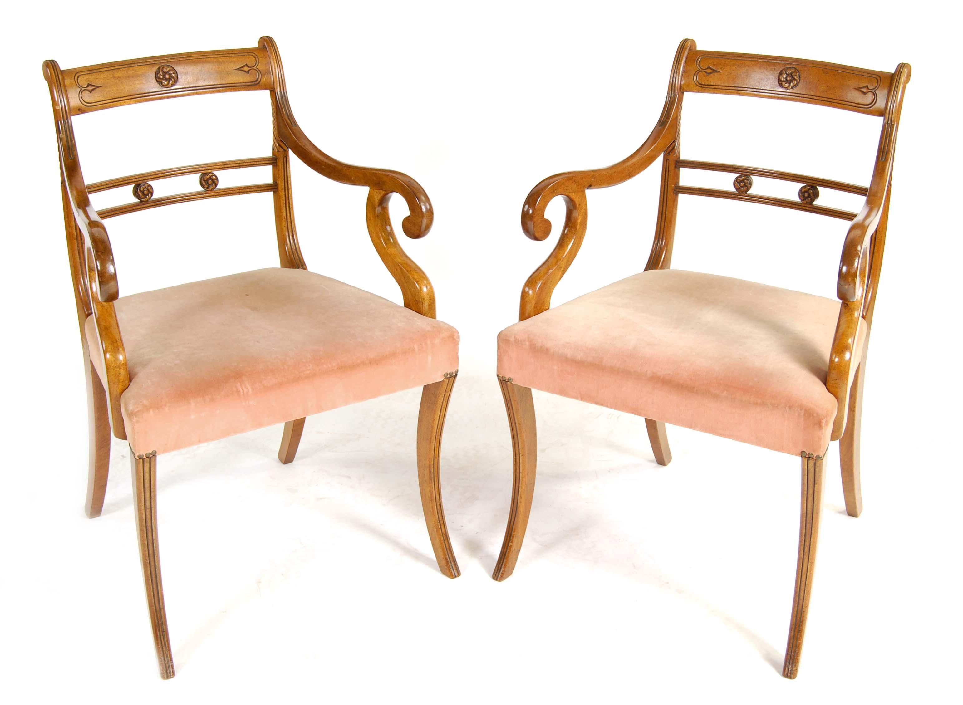 A pair of mahogany open armchairs in Regency style, the flower head carved bar back to scroll arms and reeded sabre legs. (2)