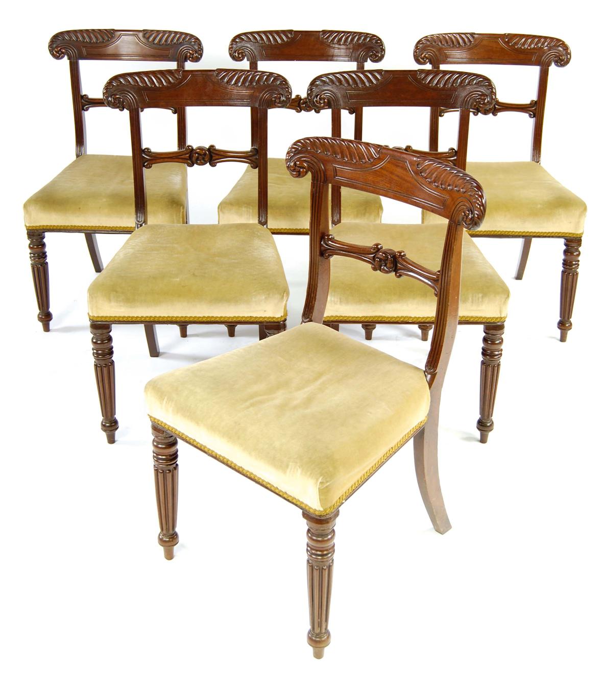Six mahogany dining chairs, each with a curved and leaf carved top rail with rosette ears above a horizontal splat, the stuffed-over seat on turned and ribbed tapering legs, three early 19th century, three modern copies. (6)