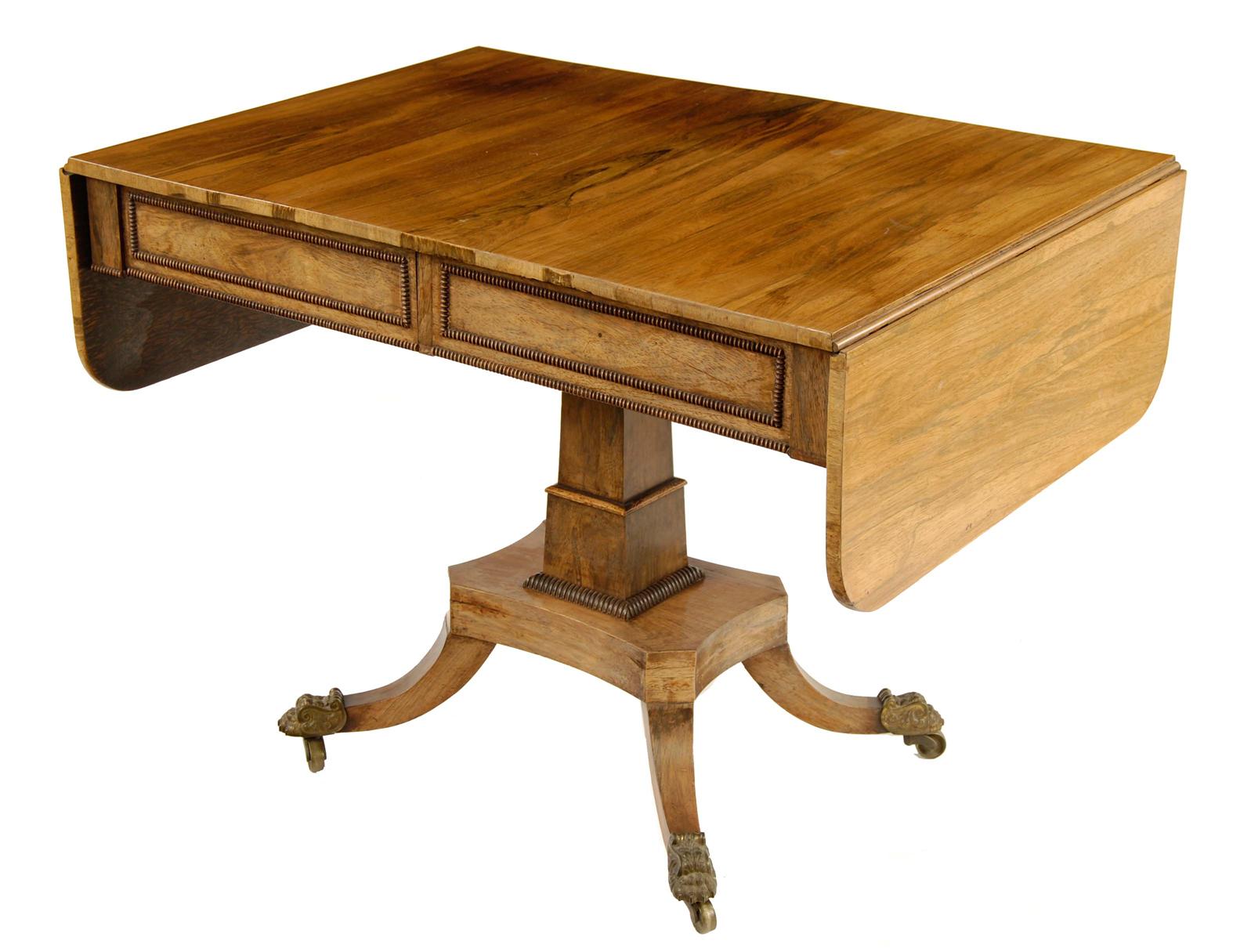 A George IV rosewood sofa table, with nulled mouldings, the twin-flap top above a pair of frieze drawers, on a stepped stem and downswept supports, terminating in brass paw sabots and castors, 28in (71cm) h, 38in (96.5cm) w, 27in (68.5cm) d.