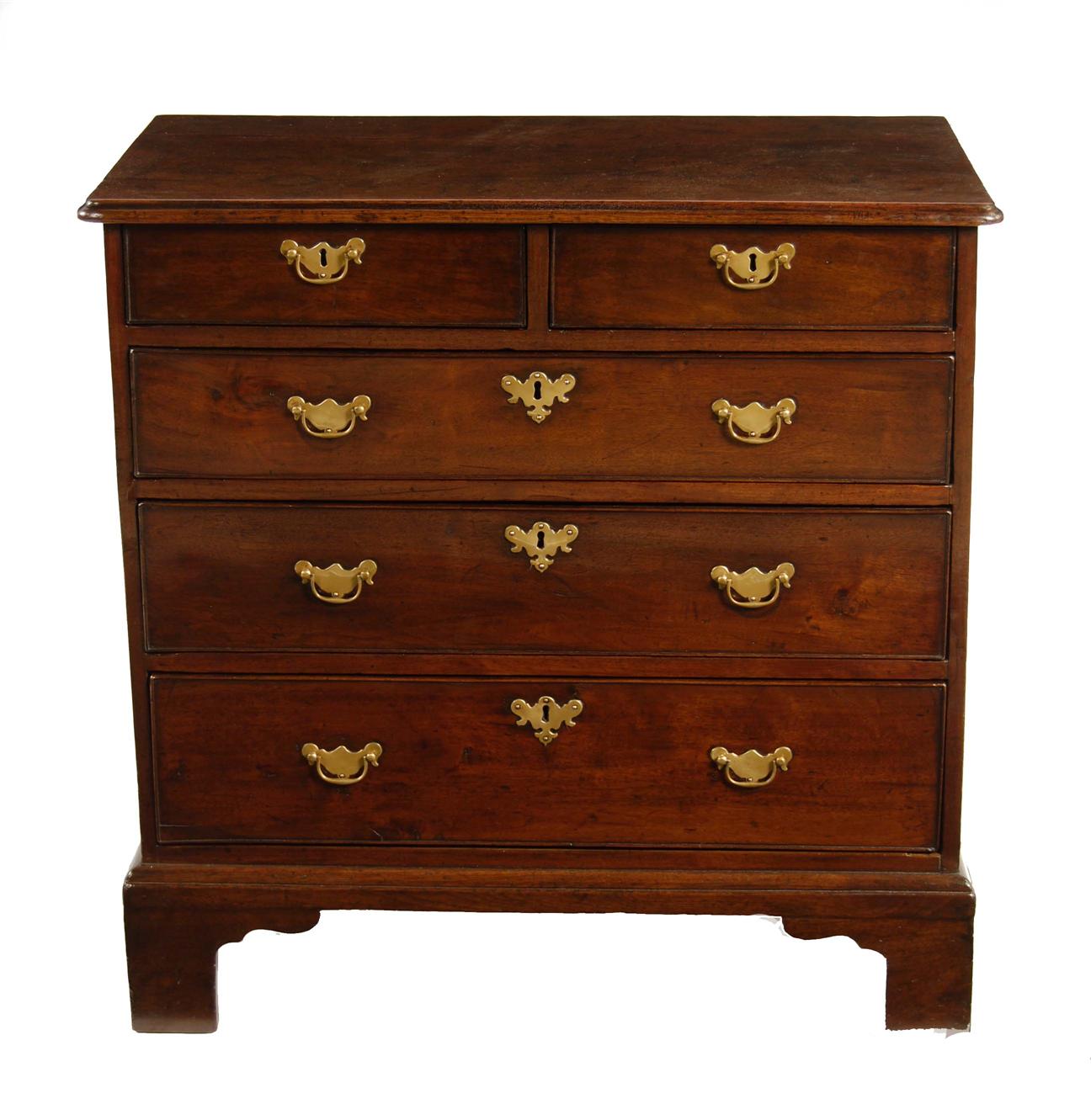 A George II mahogany chest, the moulded edge top above two short and three long graduated drawers fitted replaced handles and escutcheons on later bracket feet, 33.75in (85.5cm) h, 34in (86cm) w, 18.5in (47cm) d.