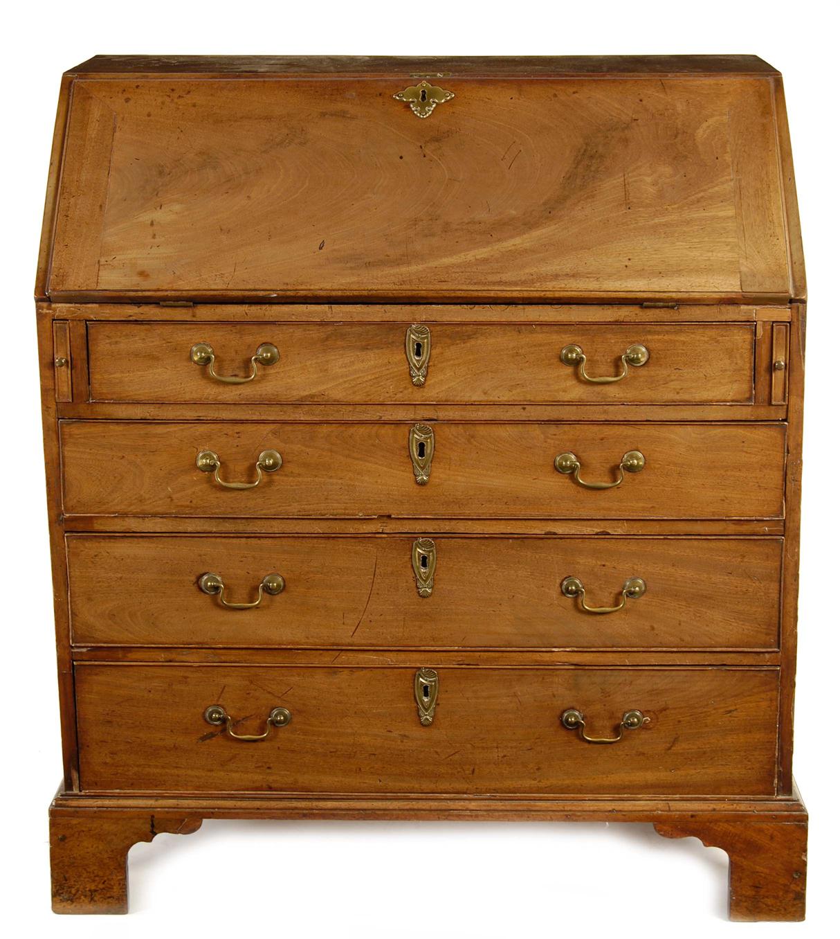 A George III mahogany bureau, the interior with pigeon holes above a bank of seven drawers, above four long graduated drawers fitted replaced brass handles and escutcheons, on bracket feet, 41in (104cm) h, 37.5in (95.3cm) w, 21.25in (53.5cm) d.