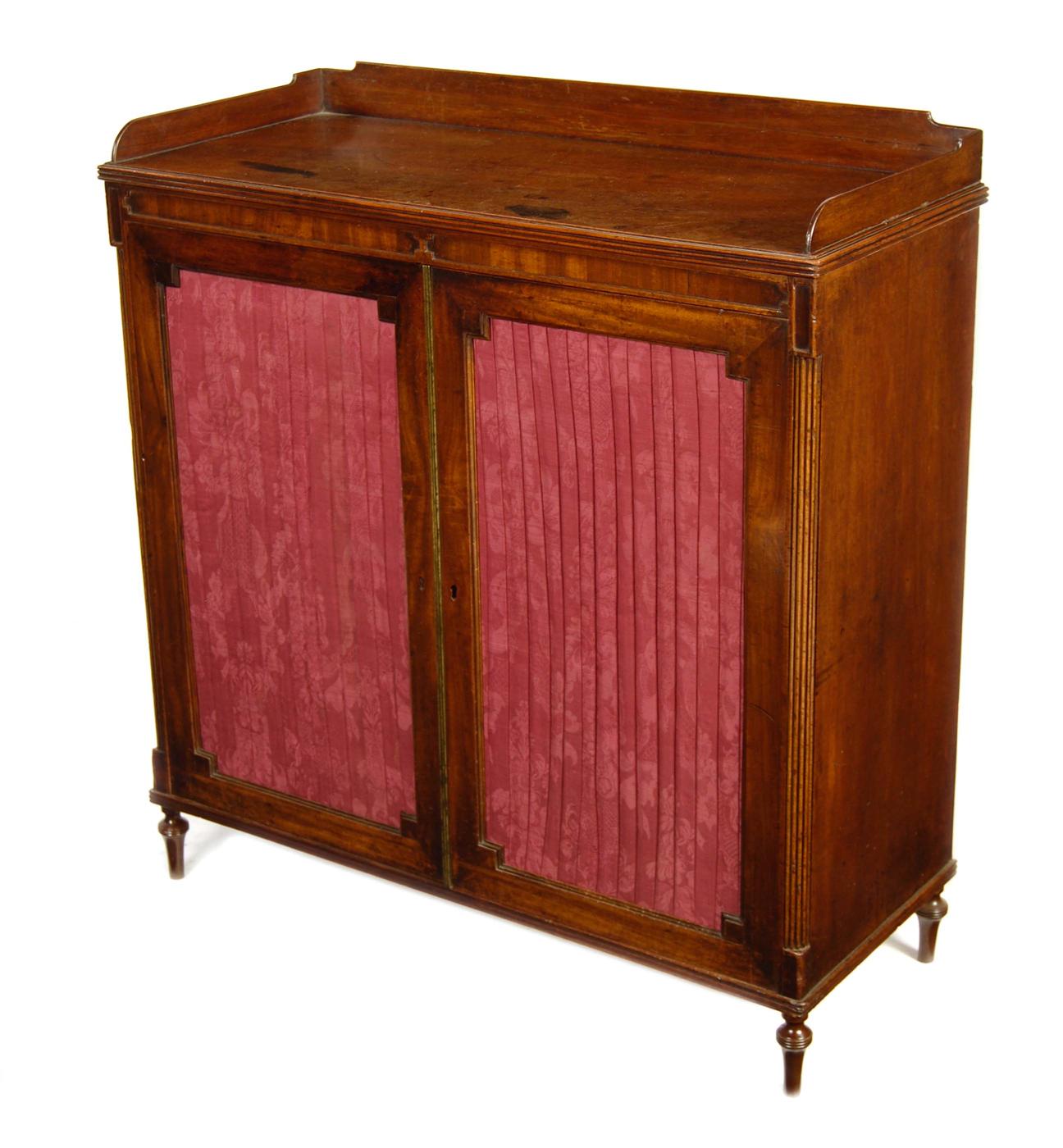 A Regency mahogany chiffonier, the reeded edge top with a shaped 3/4 gallery above a pair of glazed and pleated silk doors enclosing two shelves on replaced slender ring turned feet, 39in (99cm) h, 36.5in (92.5cm) w, 15.25in (38.5cm) d. Restorations.