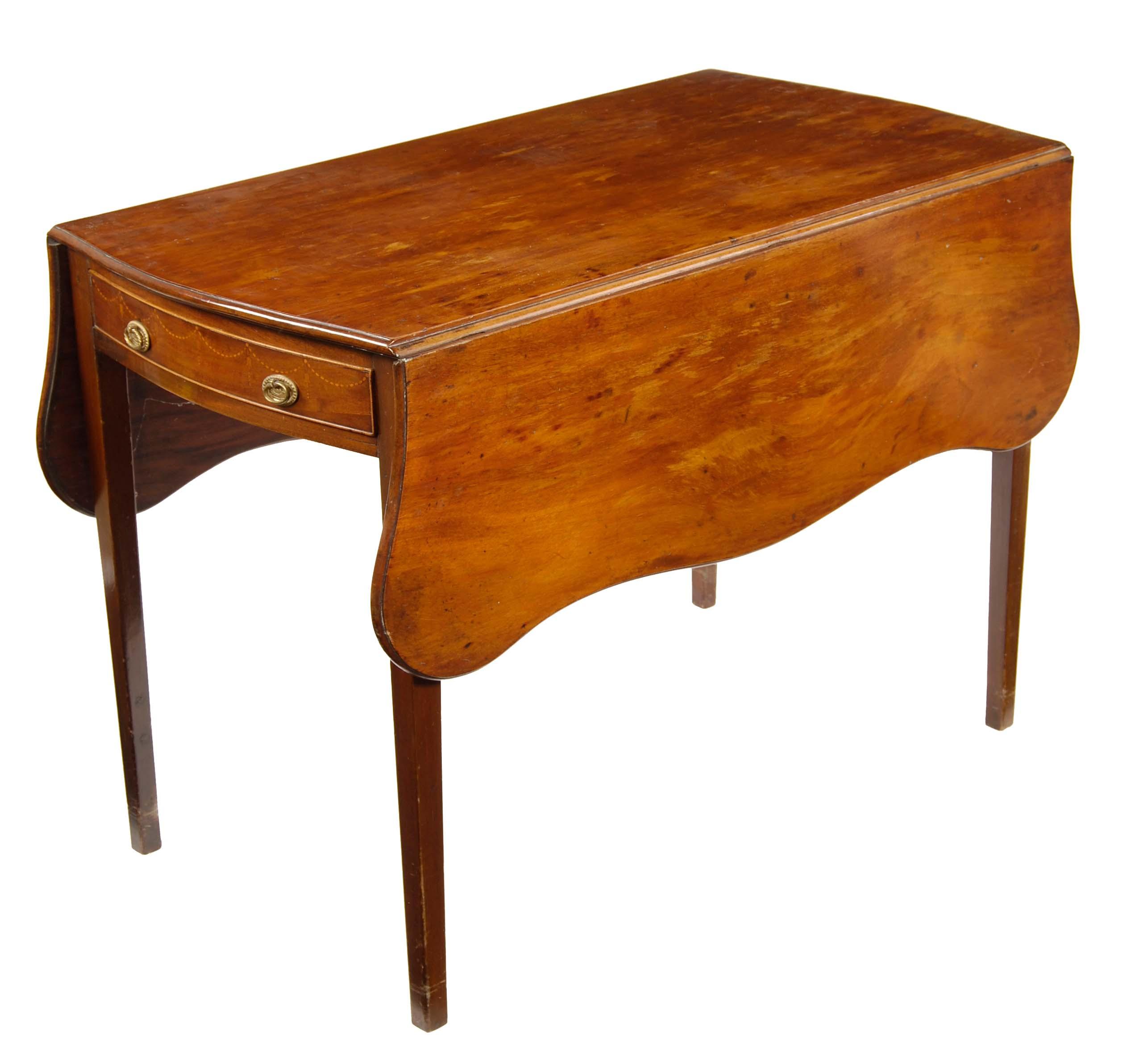 A George III mahogany Pembroke table, the serpentine moulded edge twin flap top above a frieze drawer to either end each inlaid husk swags, on square tapering legs, 28.25in (71.3cm) h, 39.75 x 46.5in (101 x 118cm) open.
