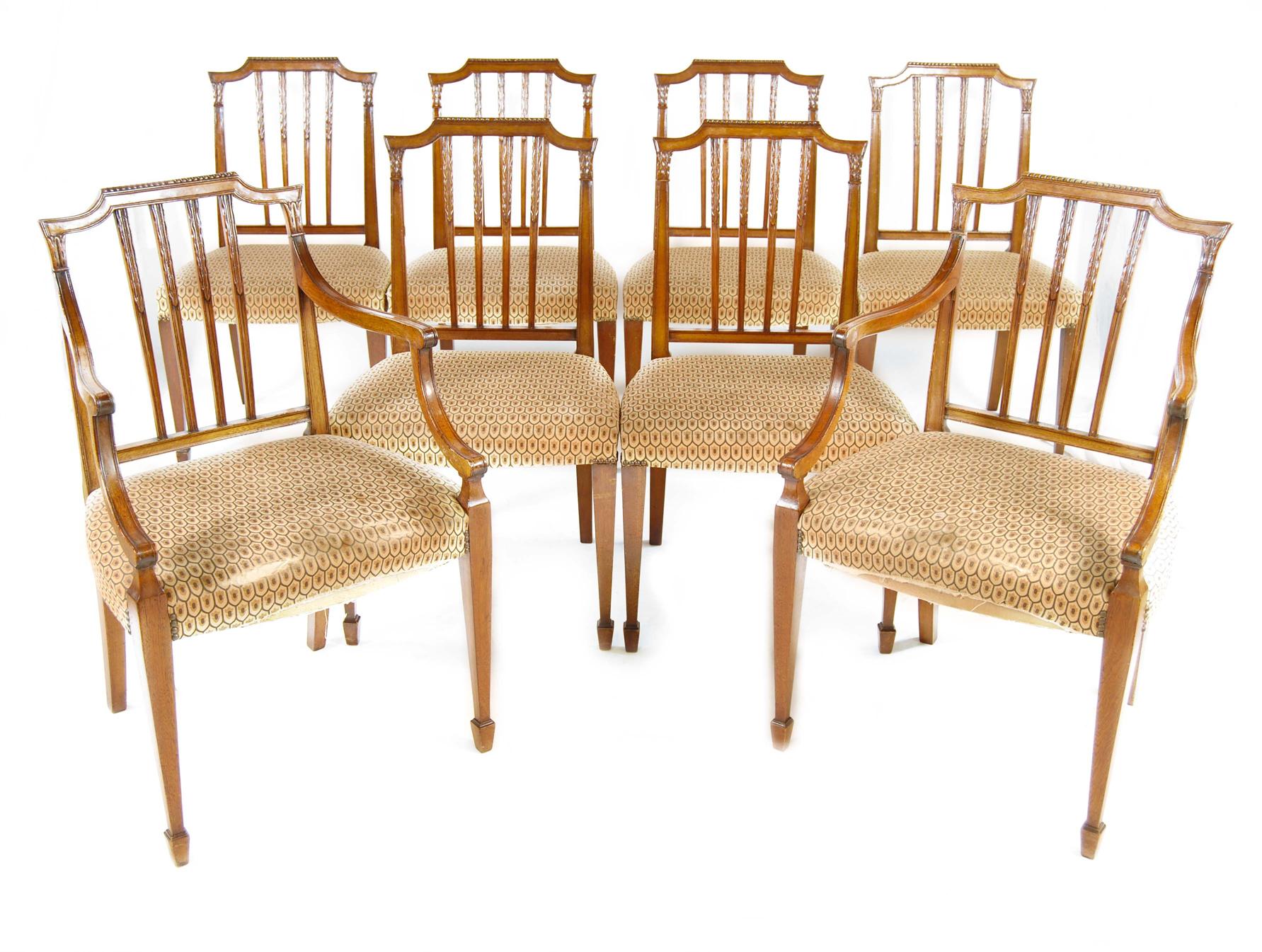 A set of eight mahogany dining chairs in Sheraton style, each with an arched rectangular back with leaf carved vertical splats, to a stuffed-over serpentine seat on square tapering legs and spade feet, comprising: two open armchairs and six side. (8) Damages.