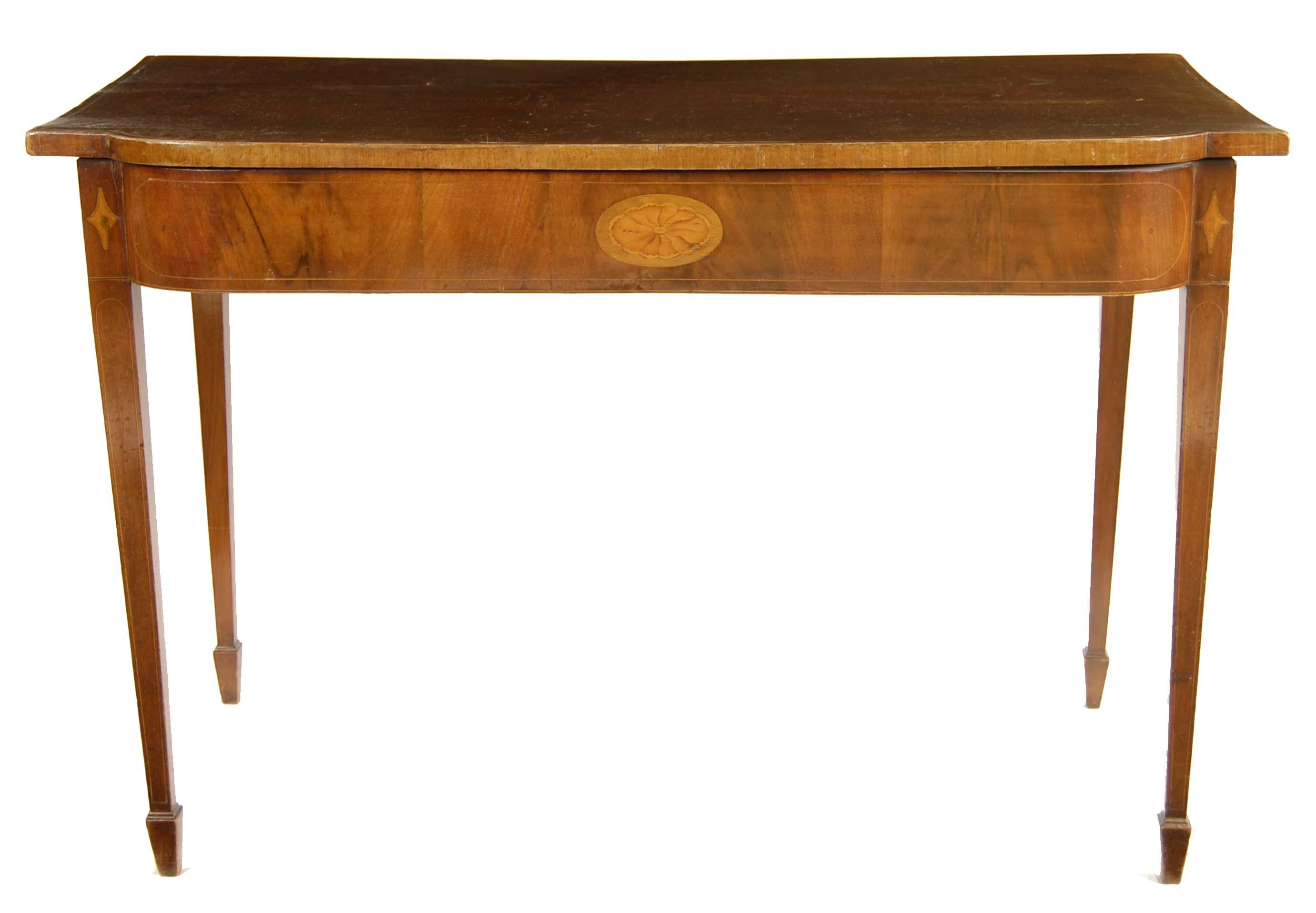 A mahogany breakfront serving table, inlaid stringing, with marquetry paterae on square tapering legs and socket feet, late 19th century, 34.25in (86.9cm) h, 51.5in (131cm) w, 23.5in (60cm) d.