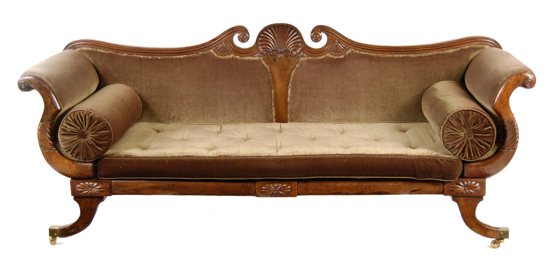 A William IV mahogany sofa, the broken swan neck pediment back centred a shell to later green draylon upholstery, with matching bolsters, on downswept supports terminating in brass caps and castors, 33.25in (84.3cm) h, 79.25in (201.4cm) w, 23in (58.3cm) d. Repairs and replacements