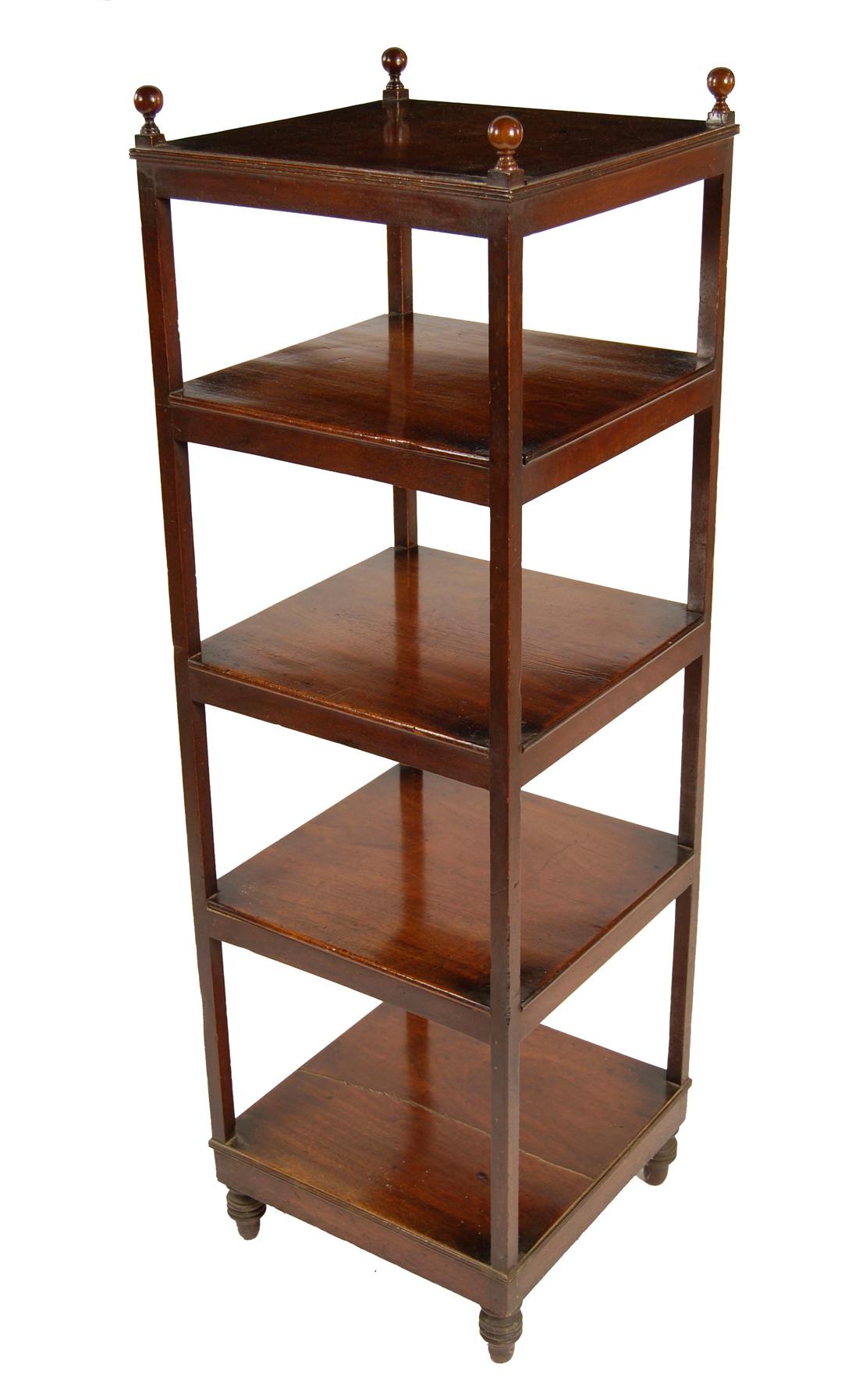 An early 19th century mahogany six tier whatnot, with ball finials, the reeded edge top on square supports and ring turned feet, 51.5in (130.8cm) h, 16.25in (41cm) w.