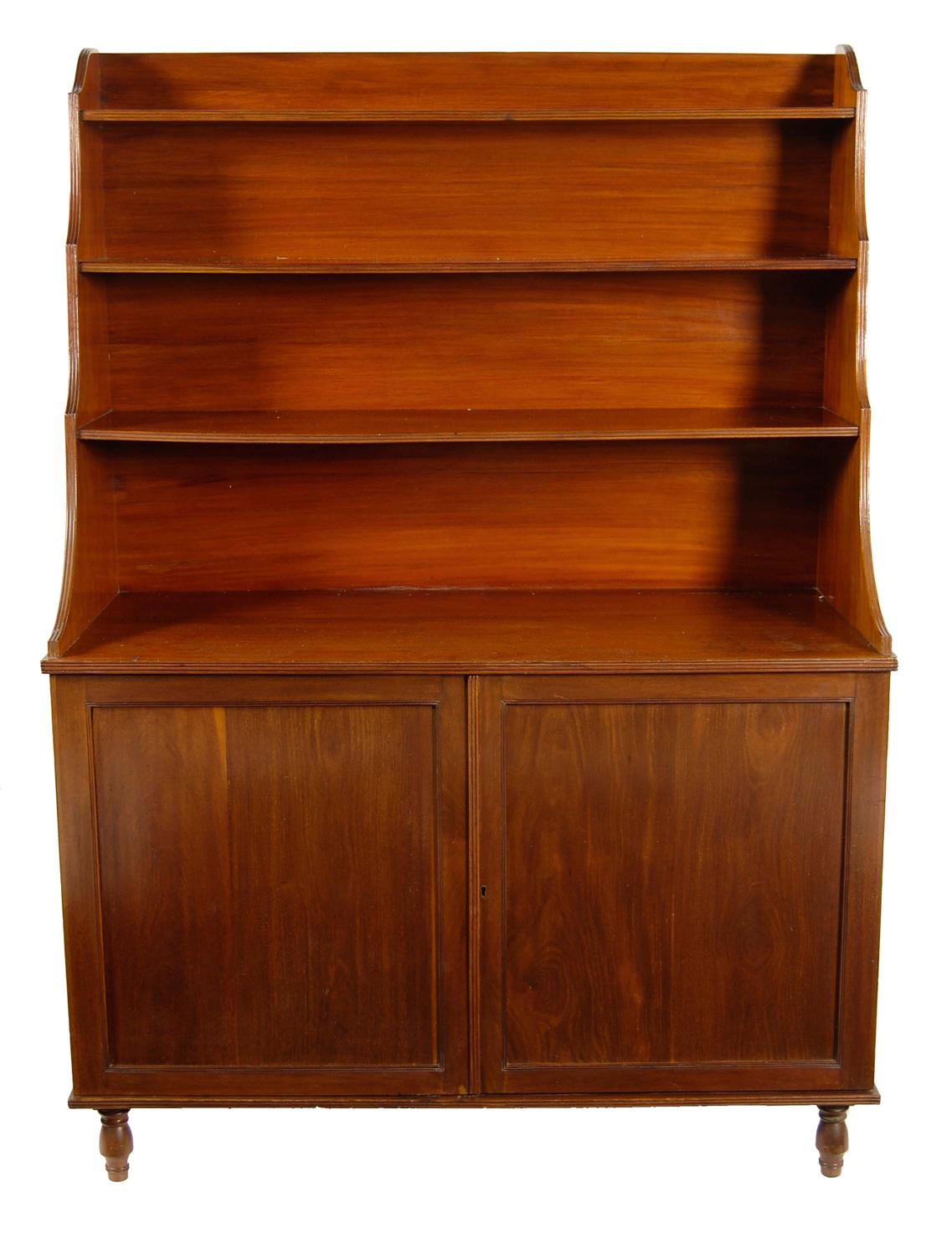 A mahogany waterfall bookcase cabinet, three graduated shelves and shaped supports, with, reeded fronts above a pair of cupboard doors enclosing a divided interior with a shelf, on turned feet, 19th century, 68in (173cm) h, 48.25in (122.5cm) w, 20.25in (51.5cm) d.