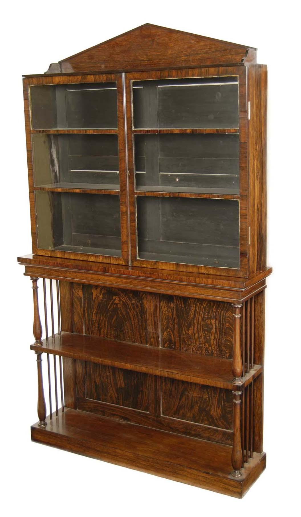 A 19th century rosewood bookcase, the detachable pediment to a pair of glazed doors enclosing two shelves, the open base on turned baluster supports, top and base associated, 74.25in (188.4cm) h, 43in (109.3cm) w, 11.75in (29.5cm) d.