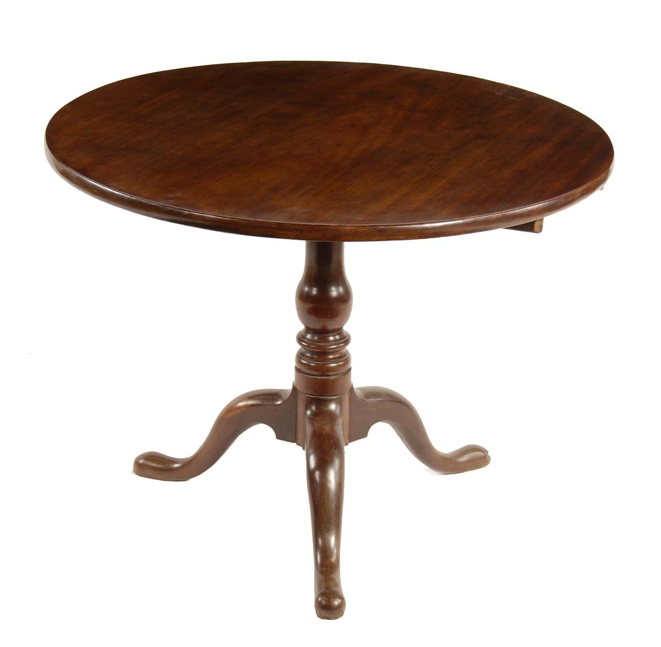 A George II mahogany tripod table, the circular tilt-top on a baluster and ring turned stem on cabriole legs to pad feet, 27.5in (69.8cm) h, 36in (91.2cm) dia.
