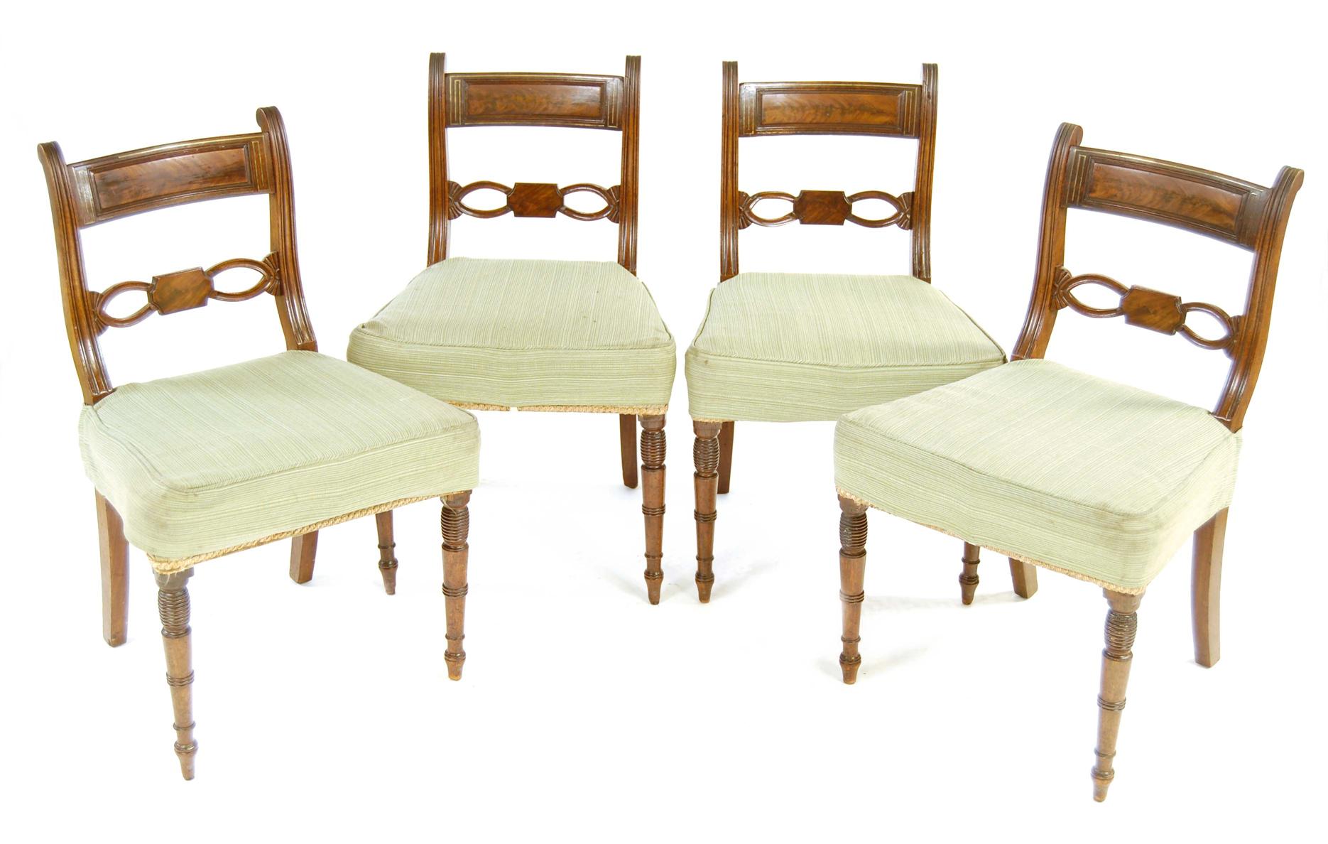 A set of four early 19th century mahogany dining chairs, each with a curved brass inlaid top rail to a stuffed-over seat and ring turned front supports. (4)