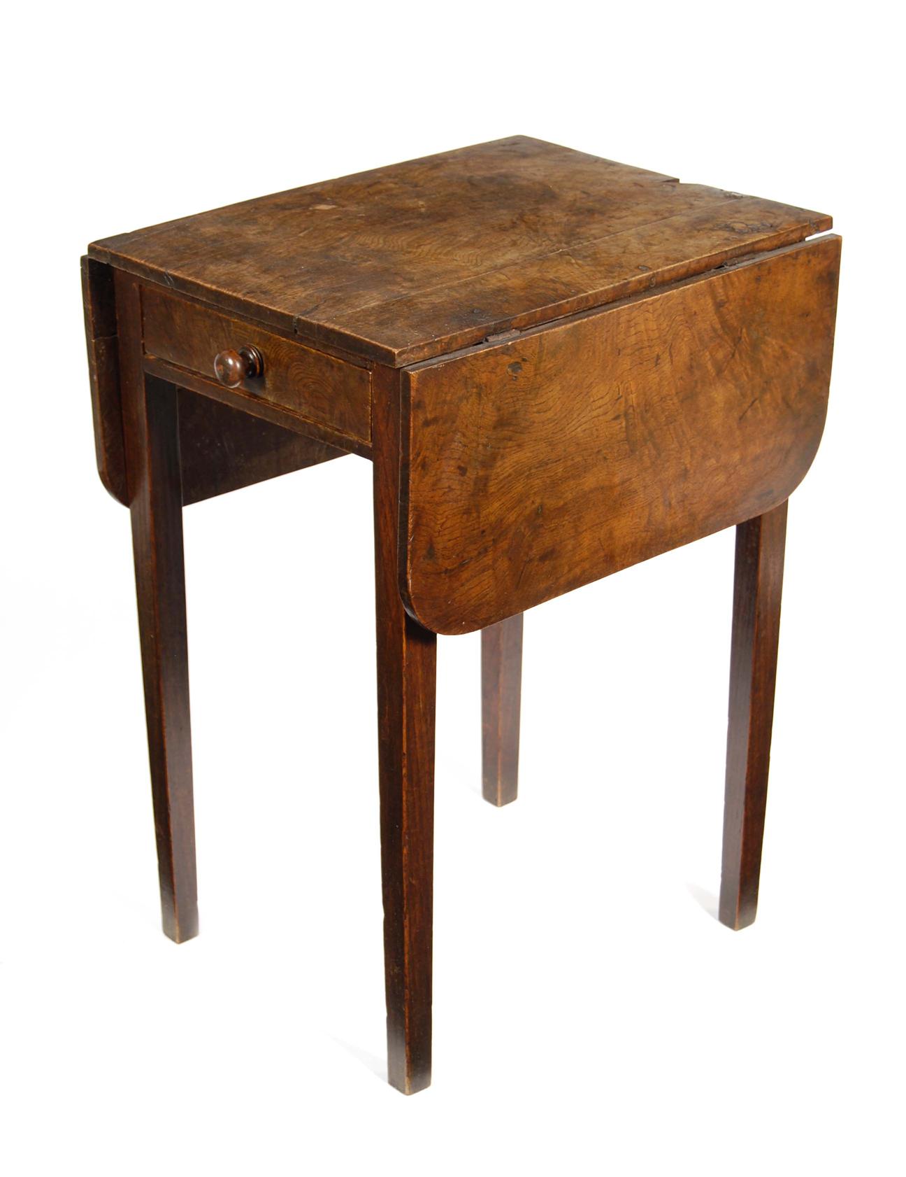 An early 19th century burr oak Pembroke table, the frieze drawer fitted a knob handle, 27in (68.6cm) h, 16.25in (41.2cm) w, 20in (51cm) d.