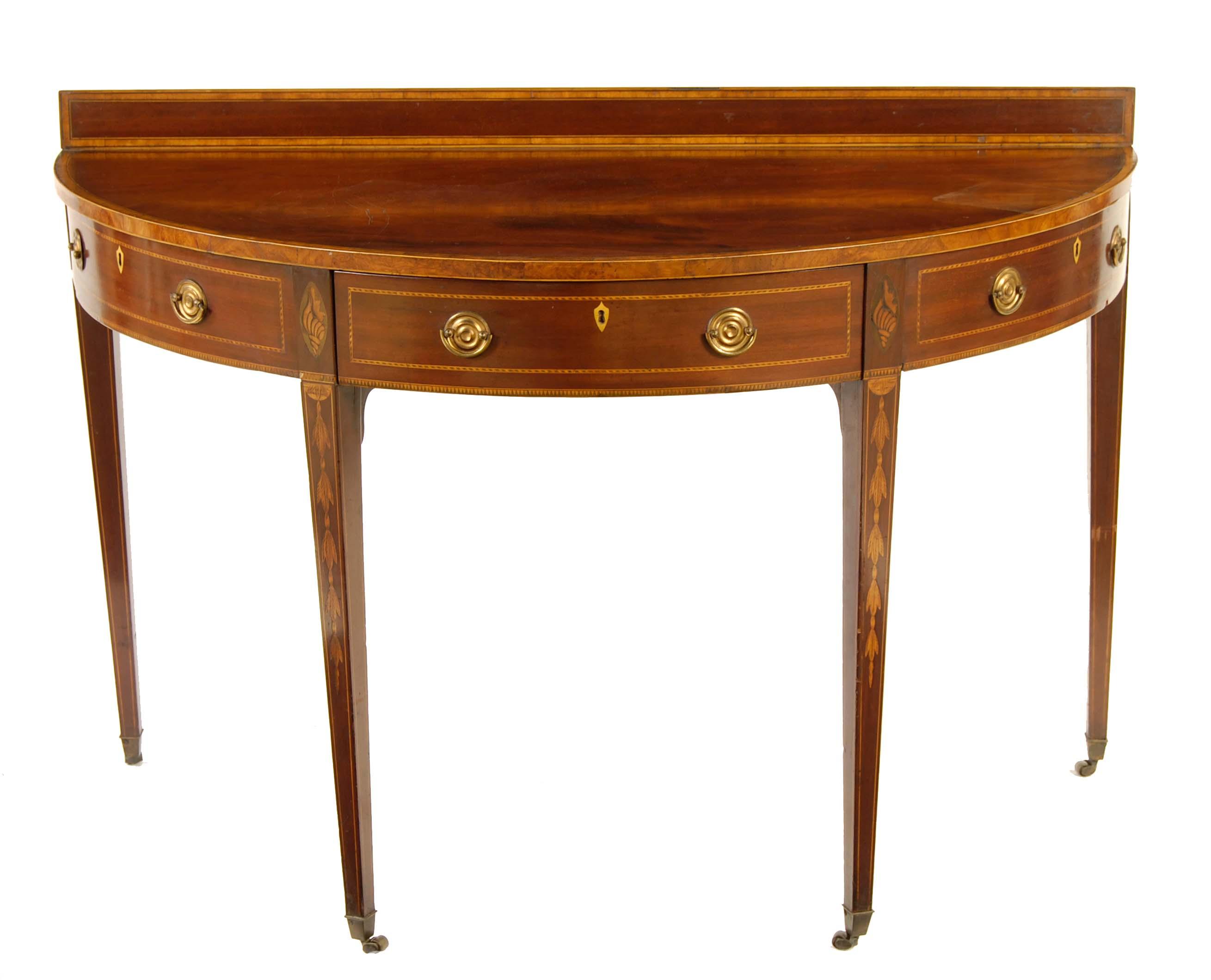 A mahogany demi-lune side table, satinwood cross banding, stringing and marquetry having a frieze drawer, with ivory shield shape escutcheons and replaced brass handles, on brass roller castors, late George III and later, 31in (79cm) h, 45.75in (116cm) w, 21.5in (54.5cm) d.
