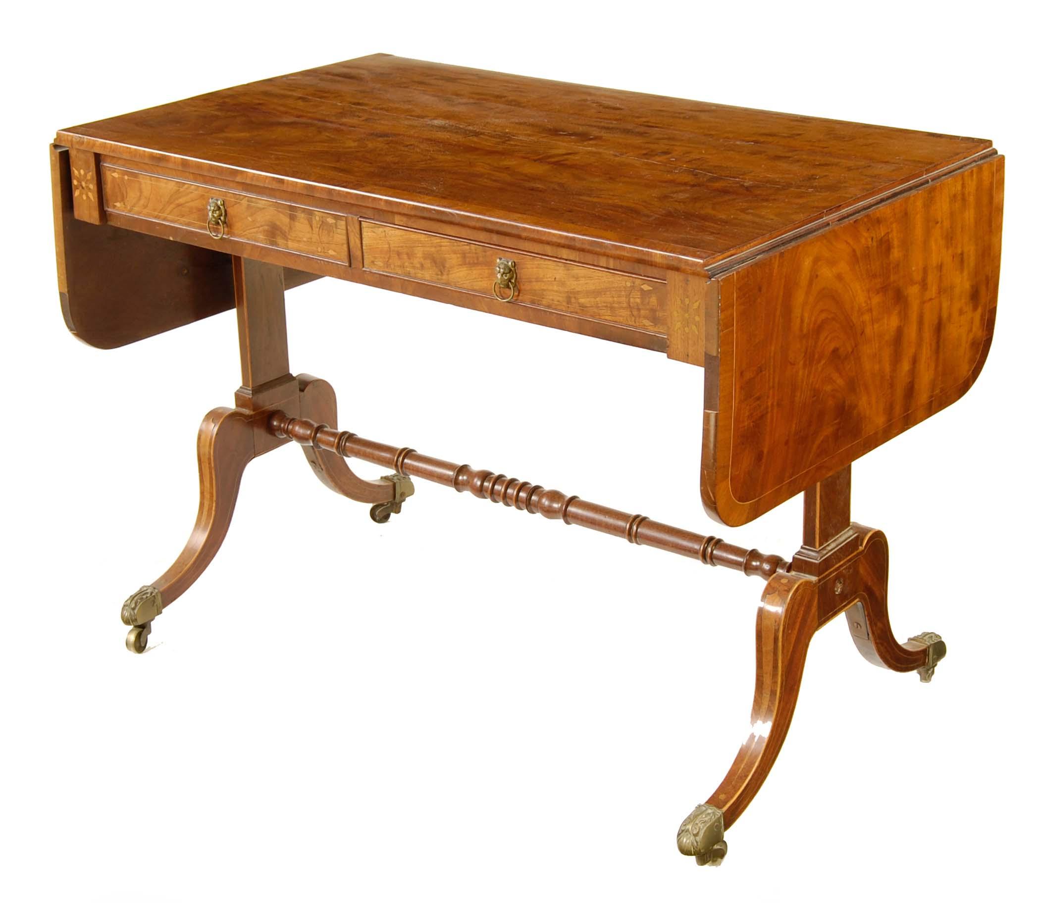 A 19th century mahogany sofa table, the crossbanded top with stringing, above a real and false drawer to each frieze, with spear head stringing on rectangular end supports united by a turned stretcher on inlaid hipped scroll legs with cast brass sabots and castors, 30in (76cm) h, 42.5in (108cm) w closed, 24.5in (62cm) d. Top cracked.