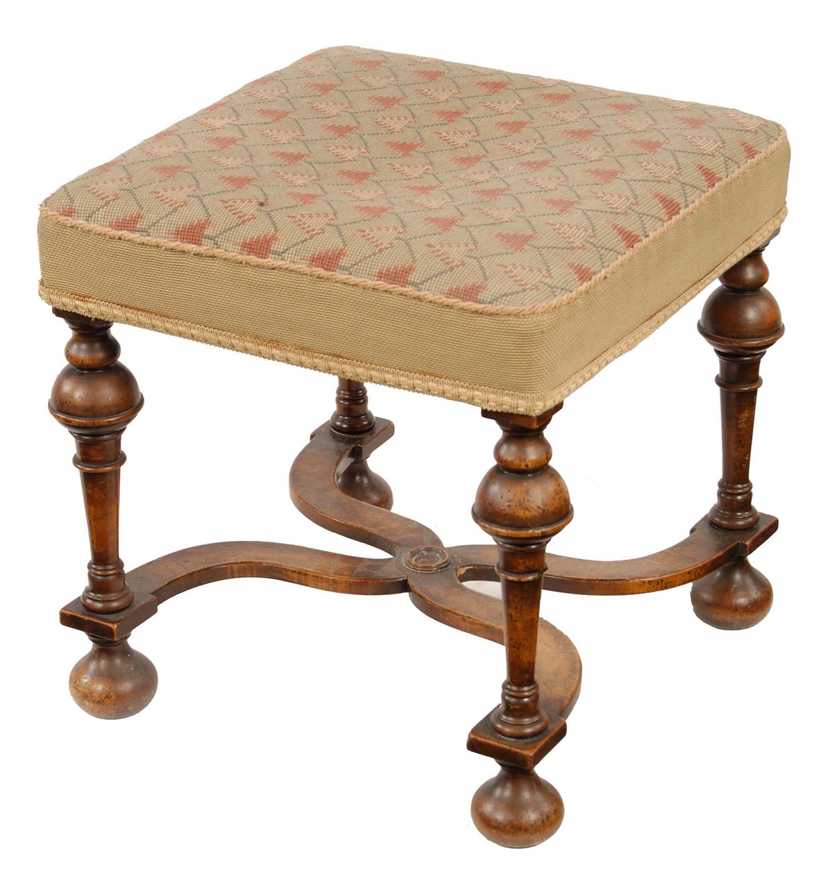 A walnut foot stool in William & Mary style, the tapestry upholstered seat on turned supports united by an 'X' stretcher, 17in (43cm) h, 17.25in (43.7cm) w.