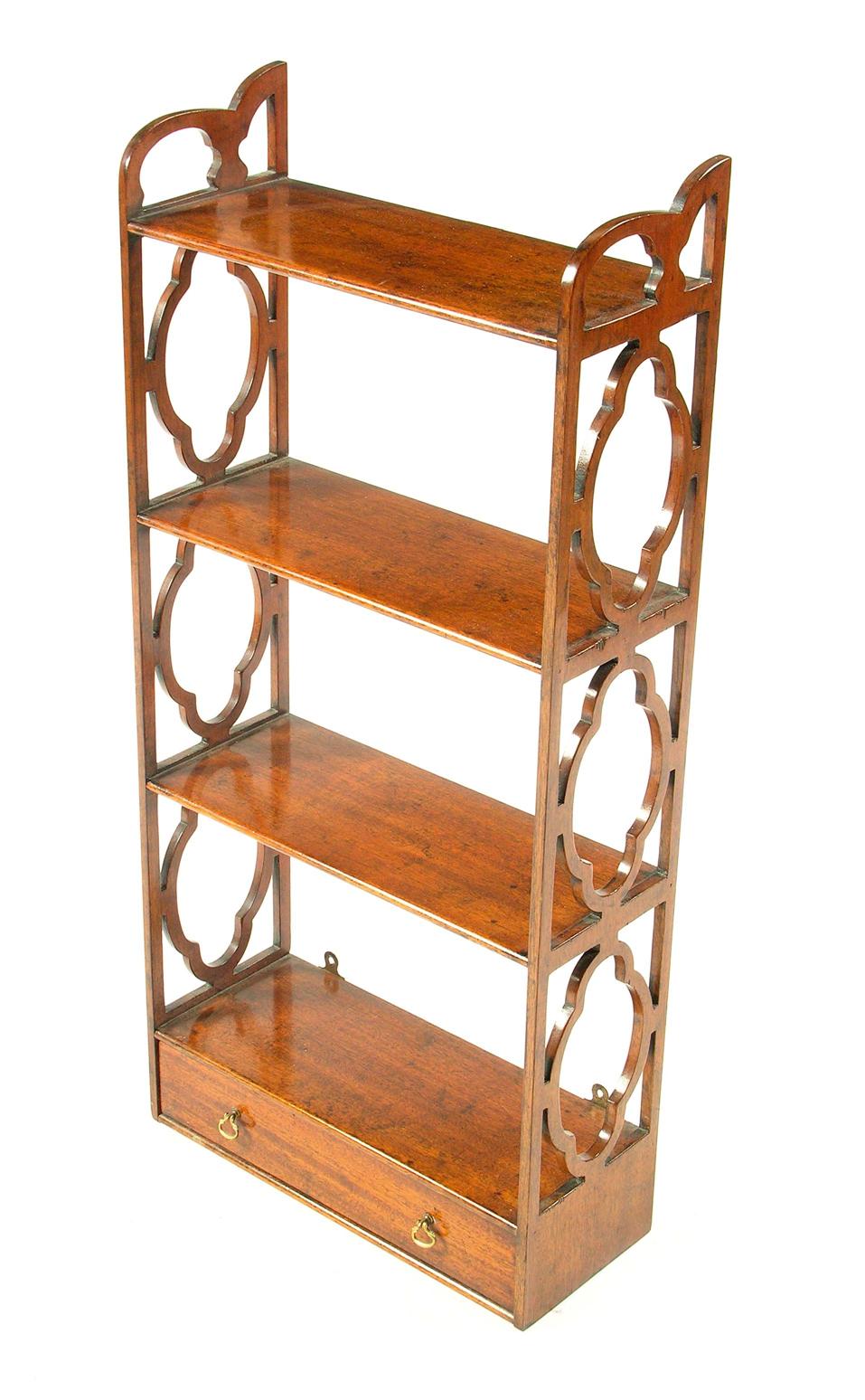 A set of mahogany wall shelves in George III style, with pierced fret sides and four tiers, the lowest fitted a drawer, 34.25in (86.7cm) h, 16in (40.5cm) w, 6.5in (16.5cm) d.