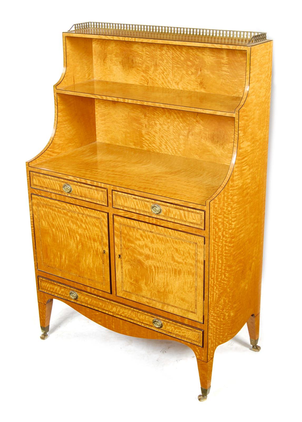 A satinwood open bookcase cabinet in George III style, inlaid ebonised stringing, the galleried top above two open shelves with two frieze drawers above cupboards and a lower drawer, on square tapering legs, brass caps and castors, 45in (114.3cm) h, 29in (73.8cm) w, 15in (38cm) d.