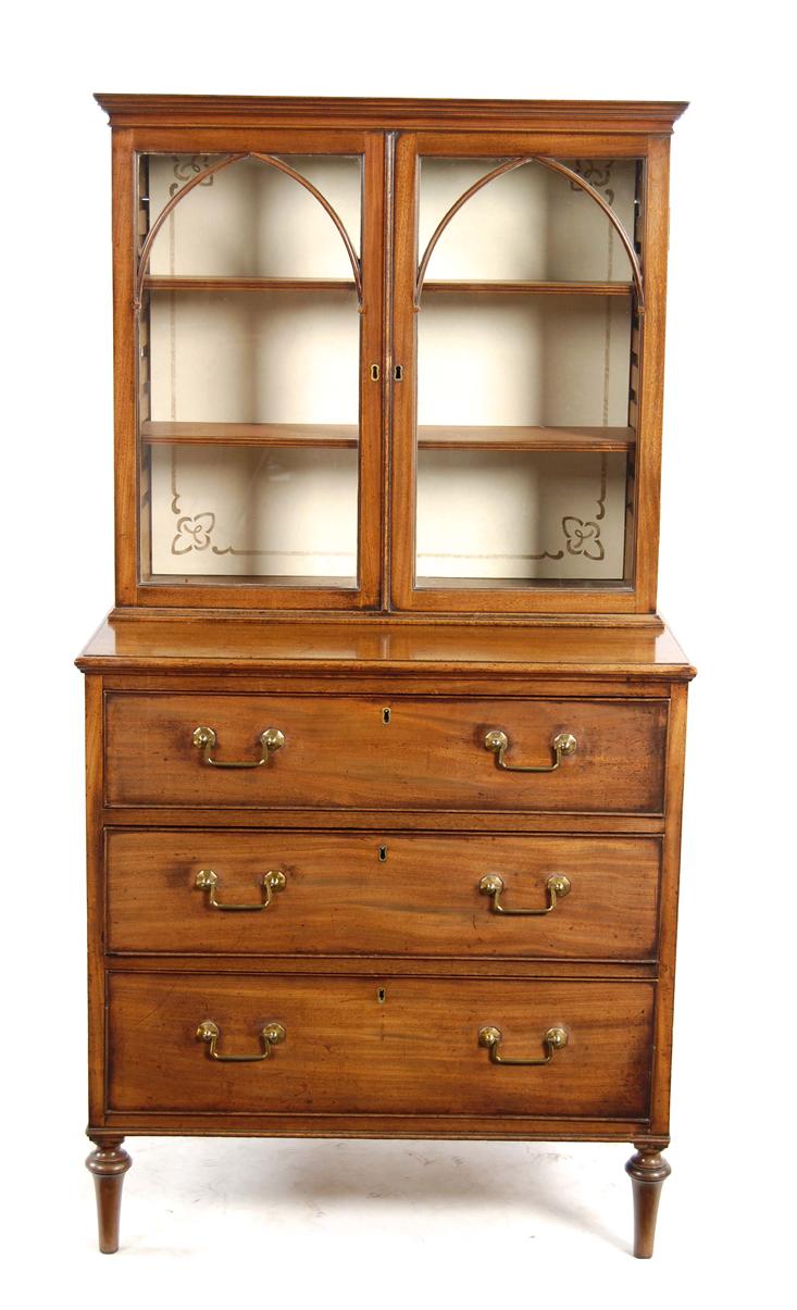 A diminutive George III mahogany bookcase on chest, the moulded cornice above a pair of lancet astragal glazed doors enclosing two adjustable shelves, the base with three long drawers fitted apparently original faceted brass handles on slender tapering feet, 53.75in (136.5cm) h, 27.75in (70.5cm) w, 17.75in (45cm) d.