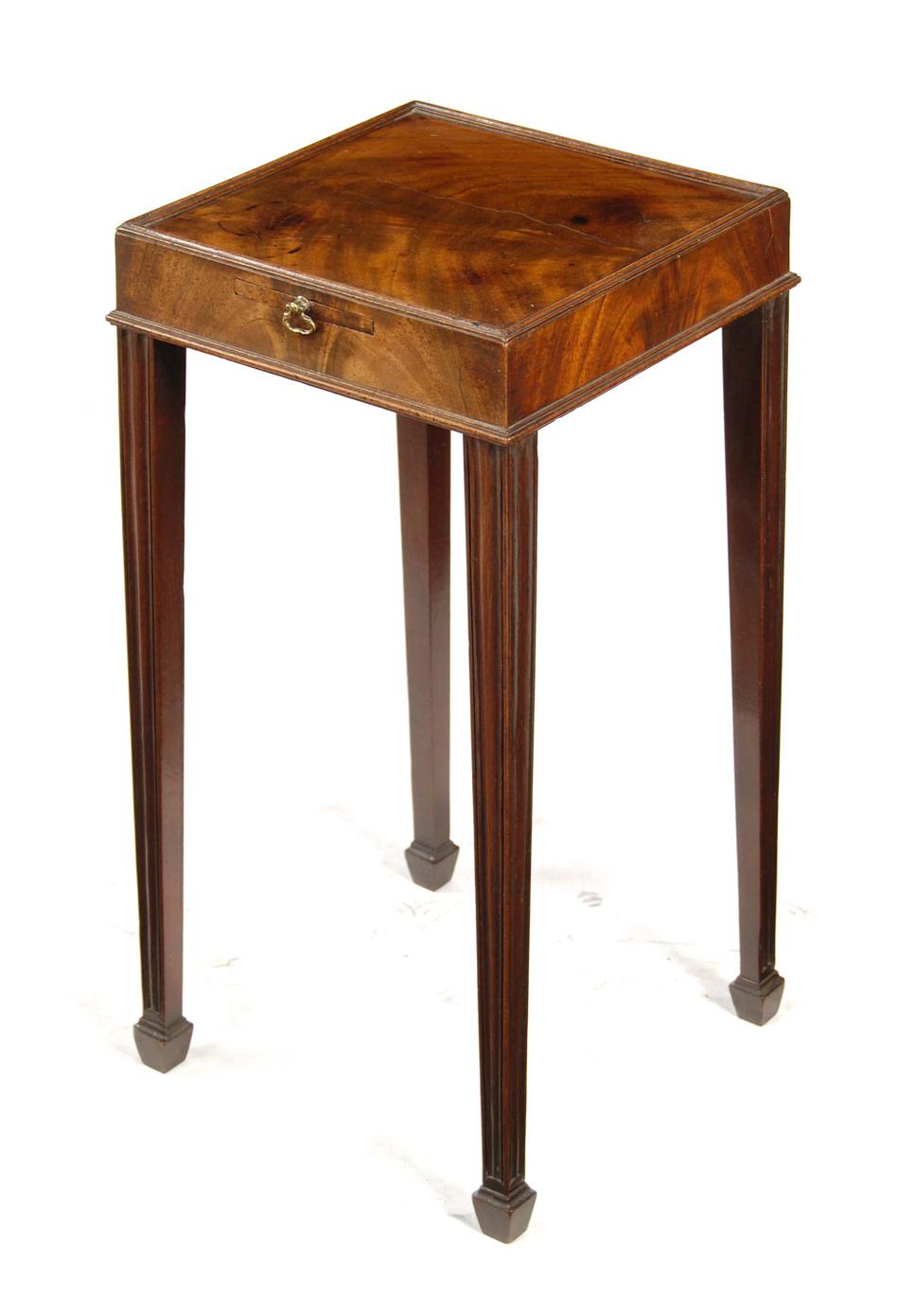 A George III mahogany urn stand, the moulded edge top above a pull-out slide fitted a brass loop handle on moulded tapering legs and spade feet, 24.25in (61.5cm) h, 12.5in (31.5cm) w.