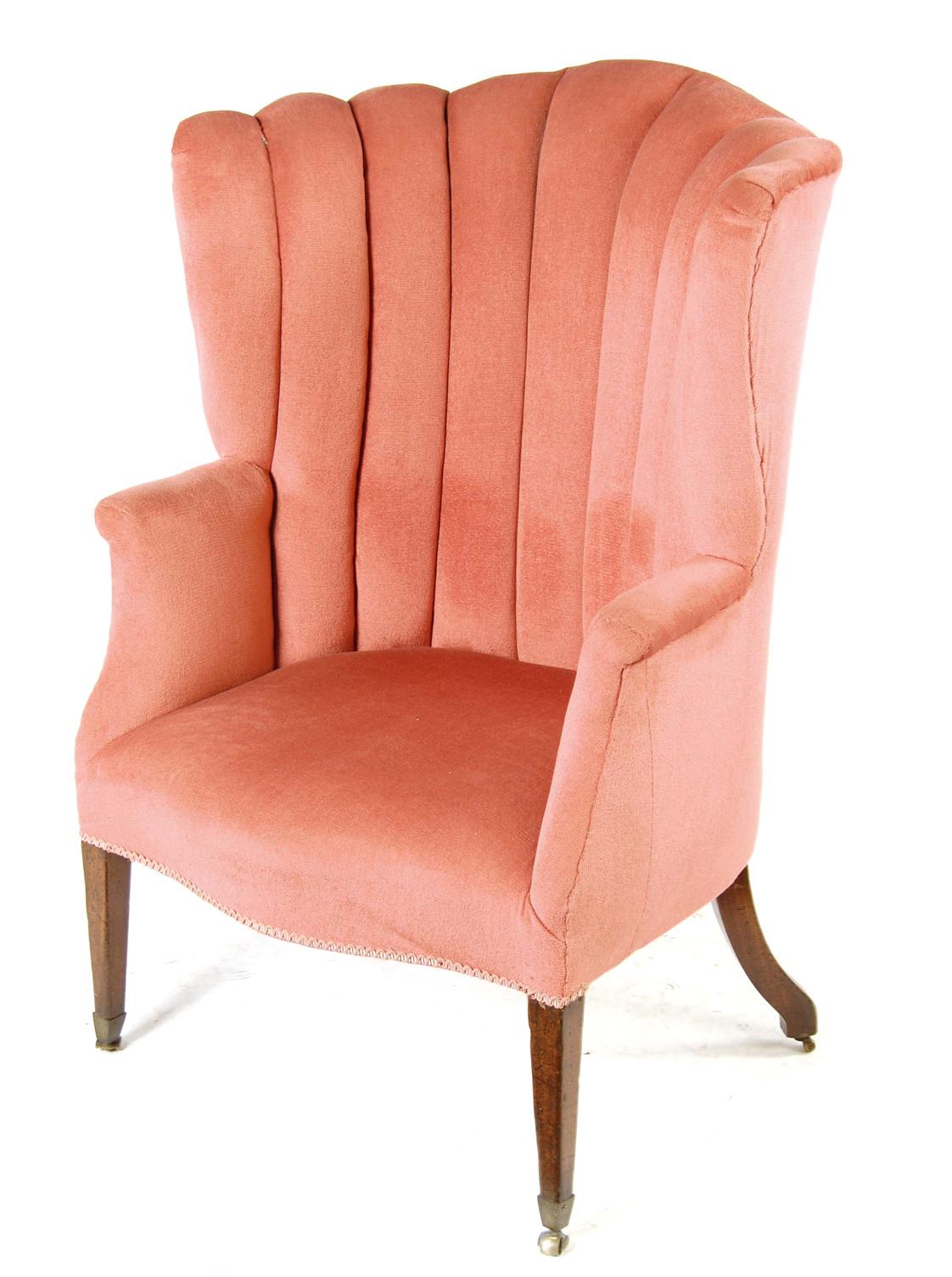 A George III wing armchair, upholstered pink draylon, on square tapering legs and brass caps and roller castors.