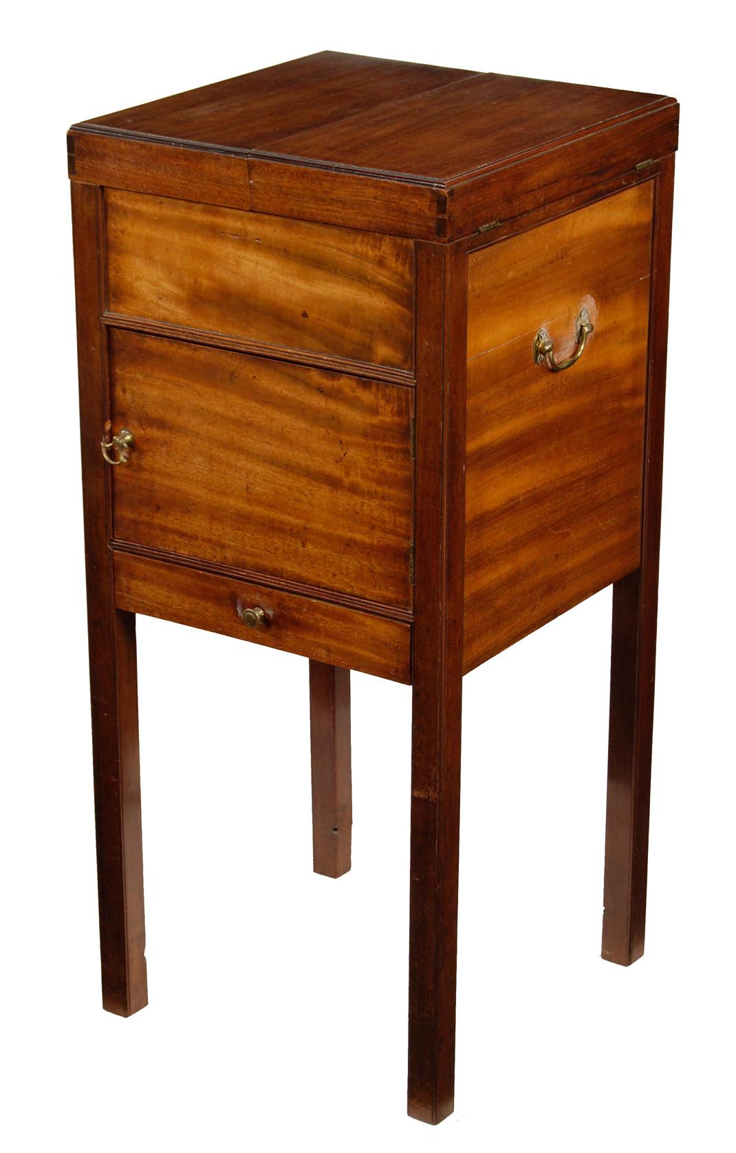 A George III mahogany square washstand, the twin hinged top revealing a later cover above a cupboard and a drawer with divisions, with side carrying handles, 31.25in (79.4cm) h, 14in (35.5cm) w.