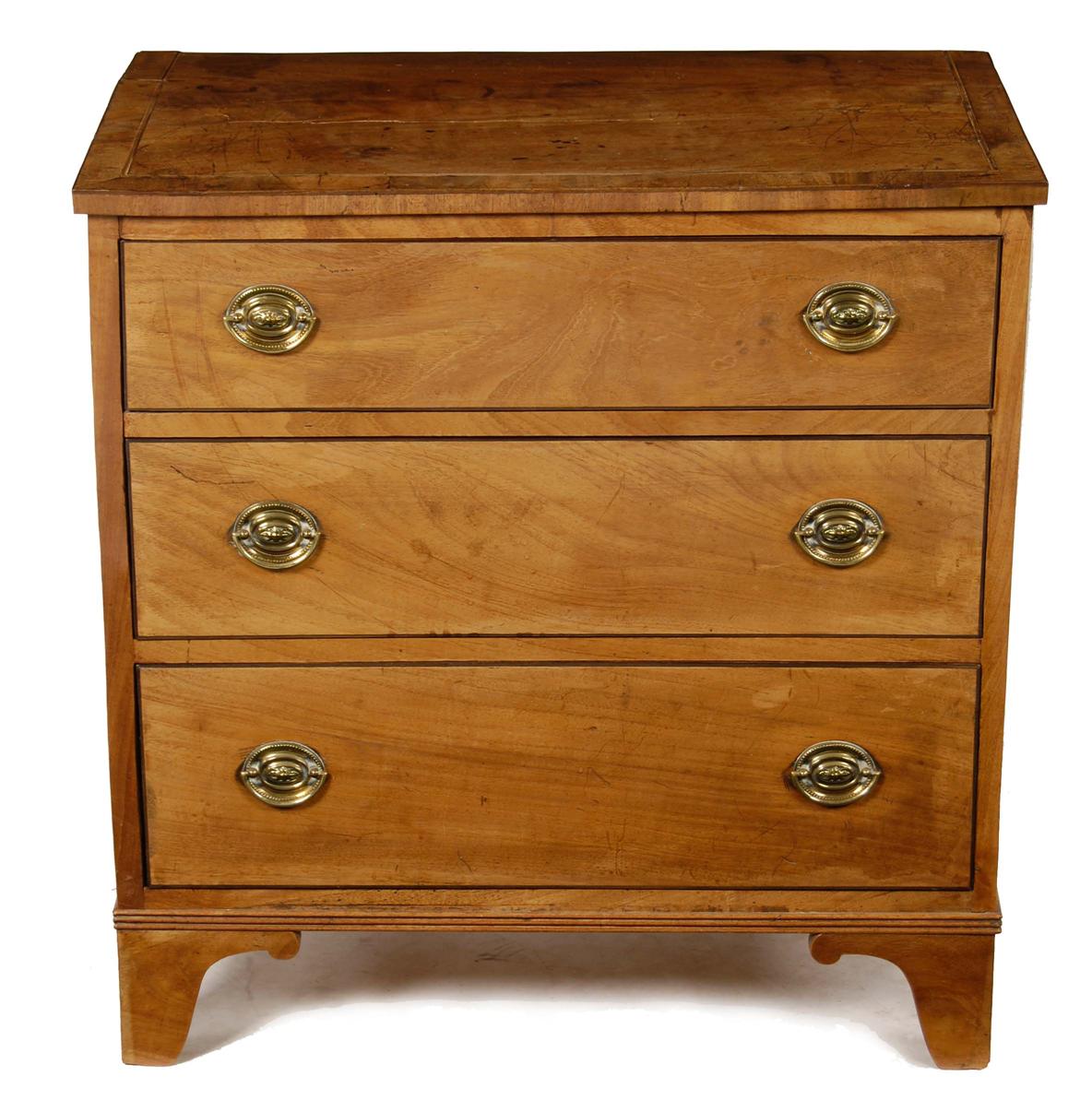 A small mahogany chest, inlaid stringing, the crossbanded top above three graduated drawers and on bracket feet, 27in (68.7cm) h, 26.5in (67.2cm) w, 16.5in (41.9cm) d.