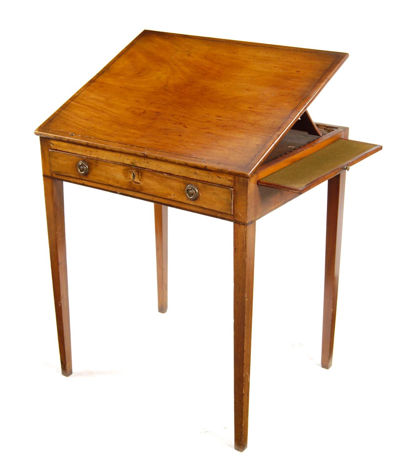 A George III mahogany architect's table, inlaid stringing, the hinged and ratcheted top with a detachable rest above pull-out baize lined slides to either side and a frieze drawer, on square tapering legs, 28.5in (72cm) h, 25in (63.3cm) w, 19.75in (50cm) d.