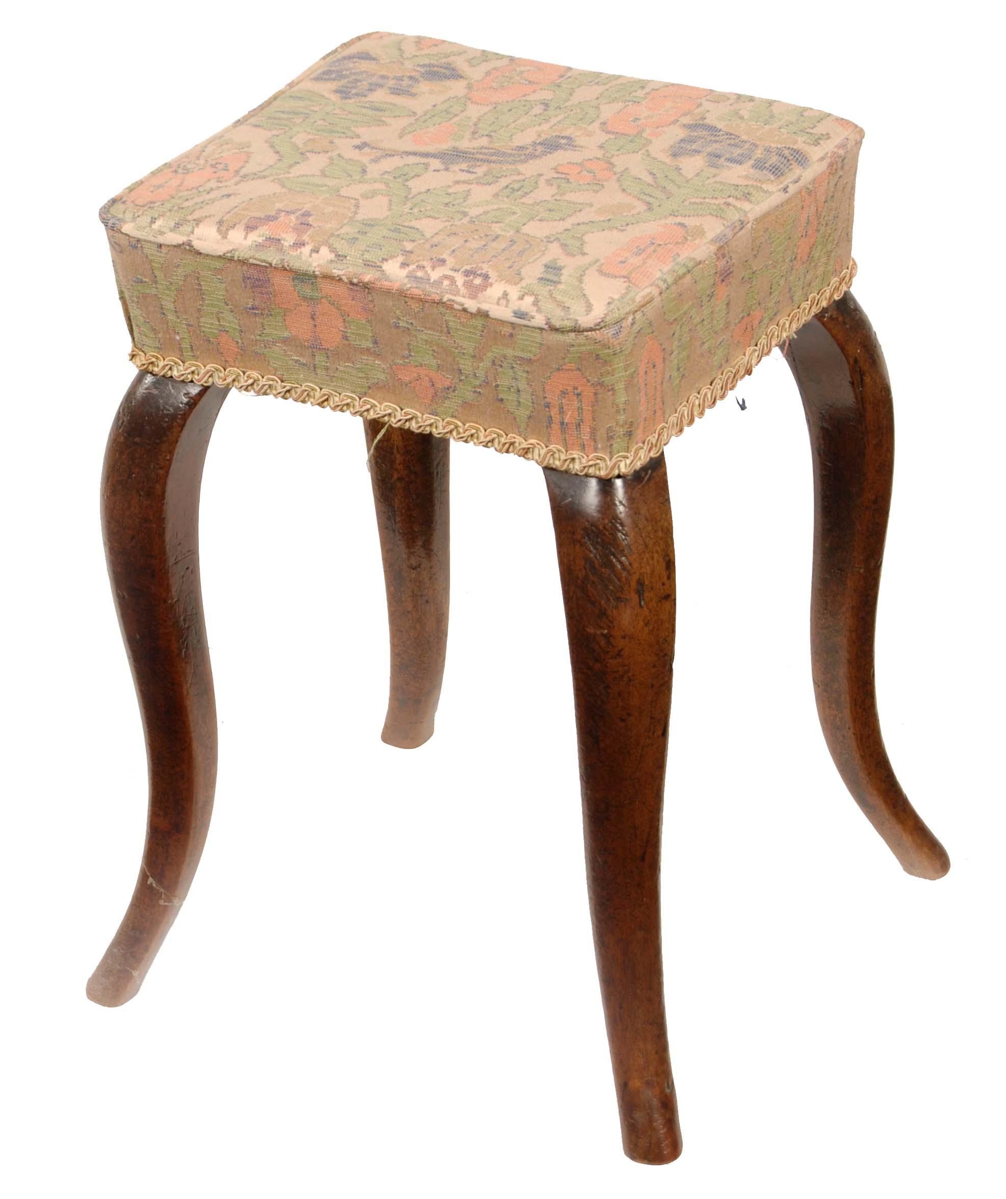 A mahogany stool, the later upholstered seat on cabriole legs, 16.5in (41.7cm) h, 13in (33cm) w, 12.25in (31cm) d.