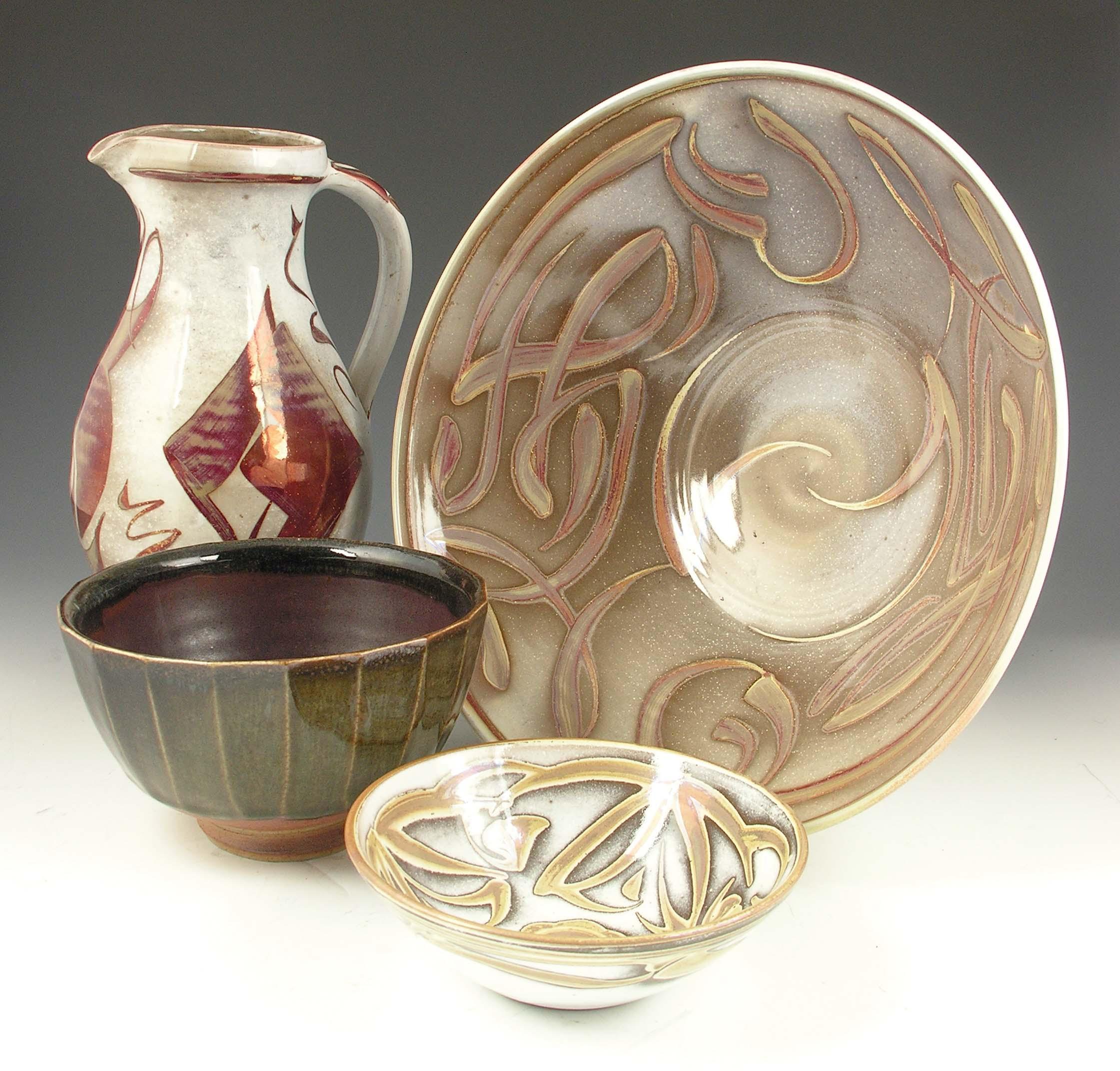 An Alan Caiger-Smith Aldermarston pottery tin glazed bowl, 14.25in (36cm) dia, a ruby lustre jug and a small bowl, together with a John Leach Muchelney pottery stoneware bowl. (4)