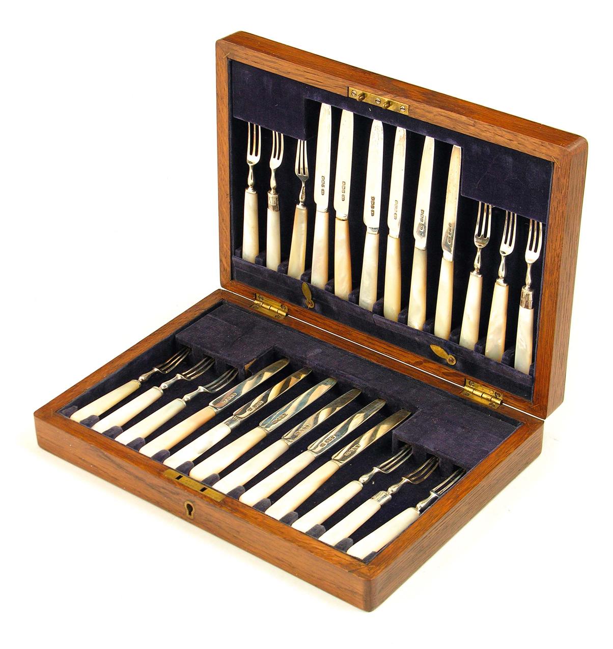 A set of six silver fruit eaters, with mother of pearl handles, Sheffield, 1897, in an oak case.