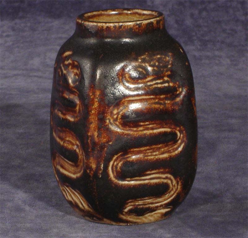 A rare Martin Brothers stoneware miniature vase by Walter F Martin, incised with serpents covered in a brown glaze incised No.7 1902 WFM 8.5cm. high