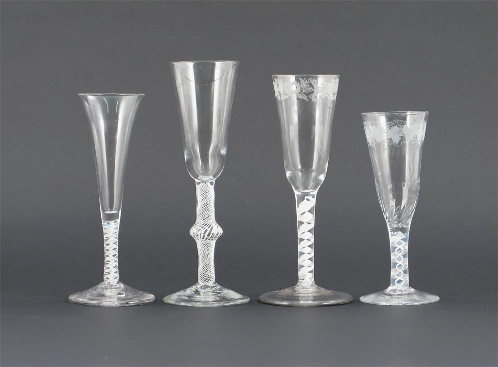 Four ale glasses or flutes, one with a wrythen moulded bowl engraved with a grapevine band, all on single or double series opaque twist stems, 2nd half 18th century, 21cm max. (4)