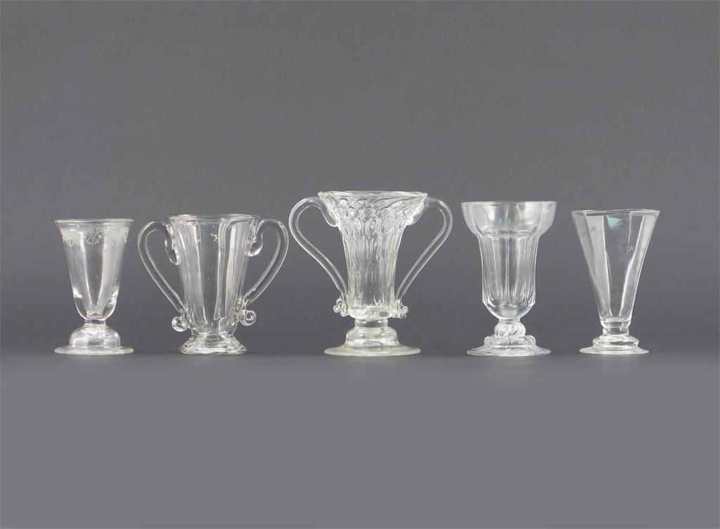 Five jelly glasses, two moulded and applied with two handles, one of flared hexagonal form, another with an engraved border, 12cm max. (5)