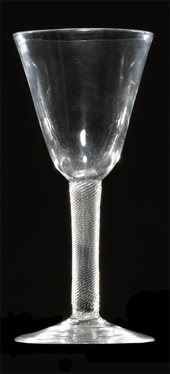 A good glass goblet of sizeable proportion, the flared bowl raised on a tall incised twist stem, c.1750, 21cm.