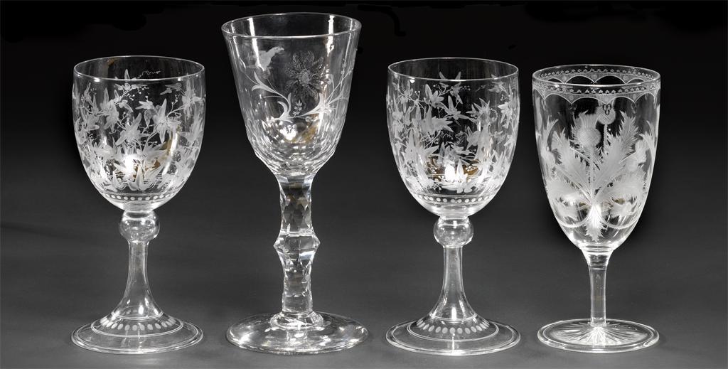 A pair of engraved goblets, decorated with an allover design of birds amongst trailing leaves, a tall goblet decorated with a large flower and a scurrying bird, and another, possibly John Ford, lavishly engraved with a thistle design, 18th and 19th centuries, a tiny chip to one footrim, 19.8cm max. (4)