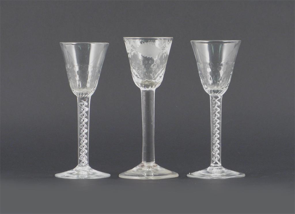 A pair of wine glasses, with hammered bowls raised on mercury-twist stems, and a wine glass with hammered bowl, engraved with a pineapple border and raised on a plain stem, 2nd half 18th century, 17.2cm max. (3)