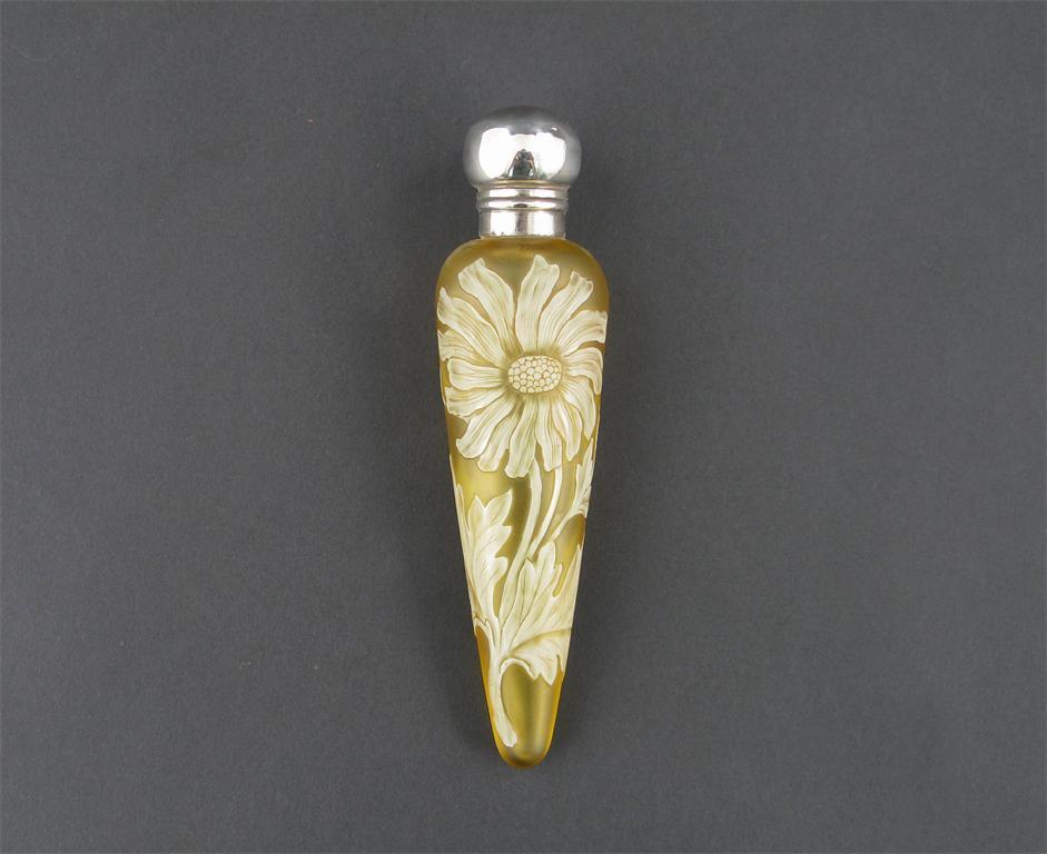 A Stourbridge cameo glass scent bottle, probably Thomas Webb & Sons, overlaid in white on a yellow ground and carved with a naturalistic flower and buds, with hinged silver metal rounded cover, 19th century, 13cm.