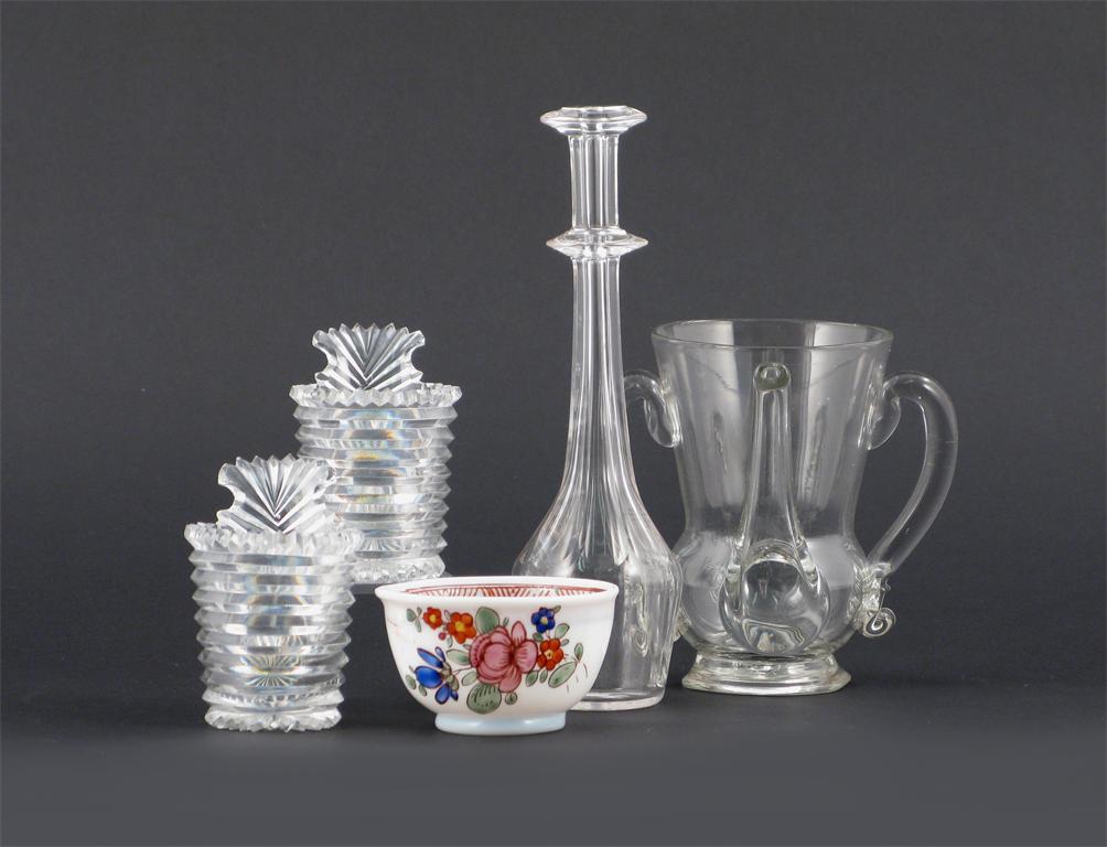 A pair of cut glass piggins, with ribbed bodies, an opaline glass teabowl painted with flowers, a glass posset pot and a toddy lifter, 18th and 19th centuries, 17cm max. (5)