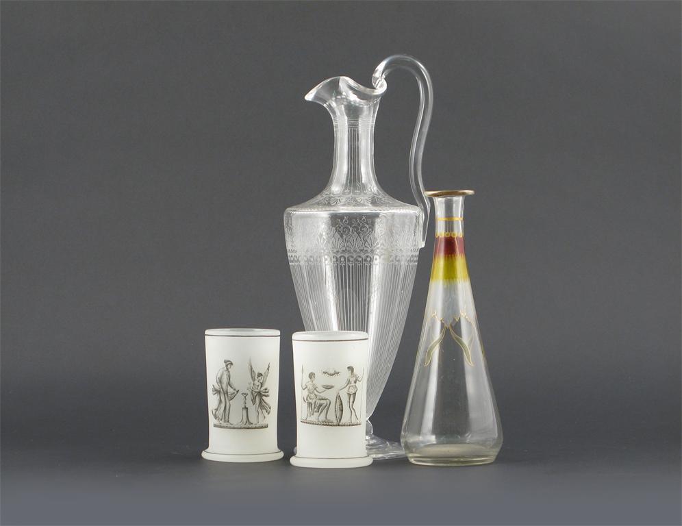 A pair of Richardson opaque glass spill vases, decorated in black with Classical and mythical figures at various pursuits, a claret jug, finely engraved with a linear design, and a tapering glass flask, painted with three bands of colour to simulate petals, late 19th / early 20th century, 32cm max. (4)