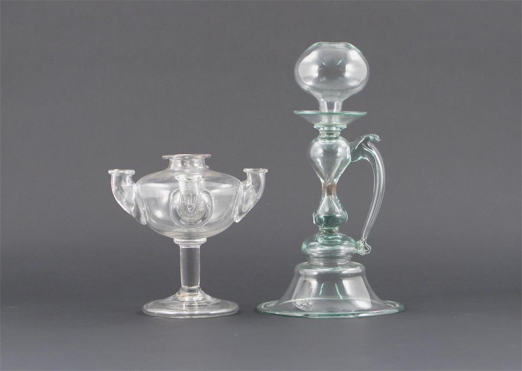 Two glass open flame lacemaker's lamps, one with a globular bowl raised on a waisted stem and tall domed foot, a handle to one side, the other with a rounded body issuing four flame points from the sides around a central opening, 18th / 19th century, 27cm max. (2)