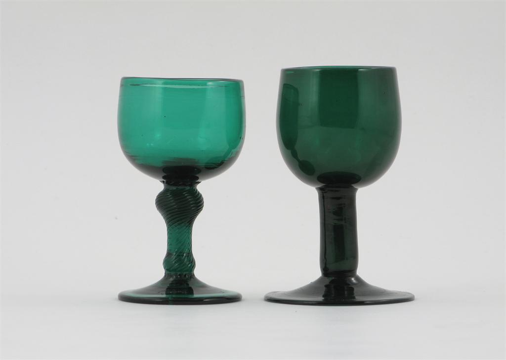 Two green goblets, one with a knopped incised twist stem, the other on a plain stem, 18th / 19th century, 12.2cm max. (2)